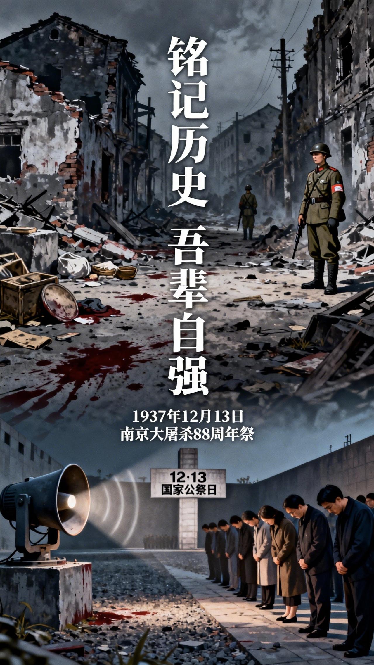 国家公祭日 铭记历史,吾辈自强。 今天是国家公祭日,87年前侵华日军攻陷南京,制造了惨绝人寰的大屠杀。这是一段不能忘、不敢忘的历史。 和平需要捍卫,强军才能安邦。我们要从历史中汲取力量,将爱国之情转化为奋斗动力,吾辈自强,让悲剧不再重演,让国家更加繁荣昌盛