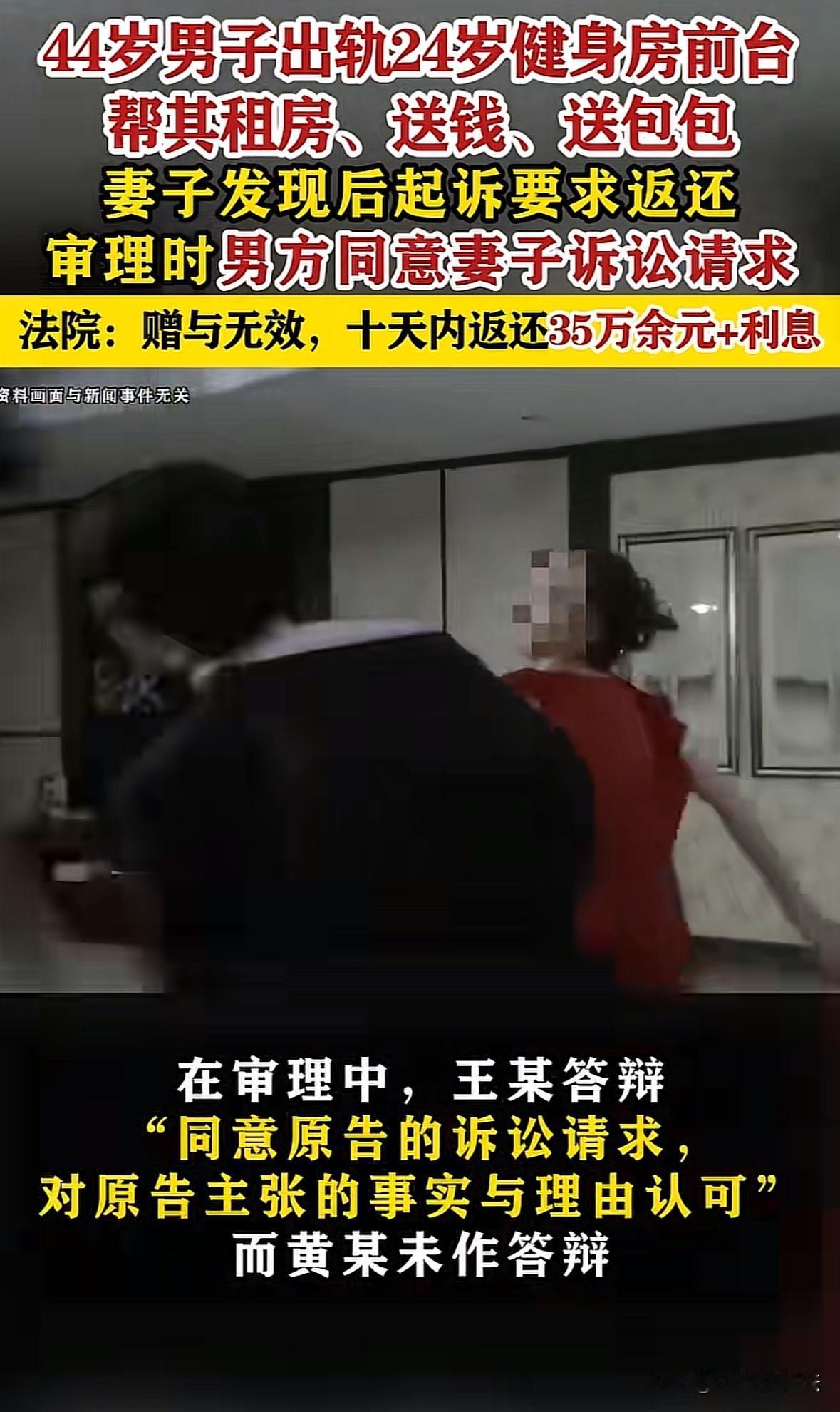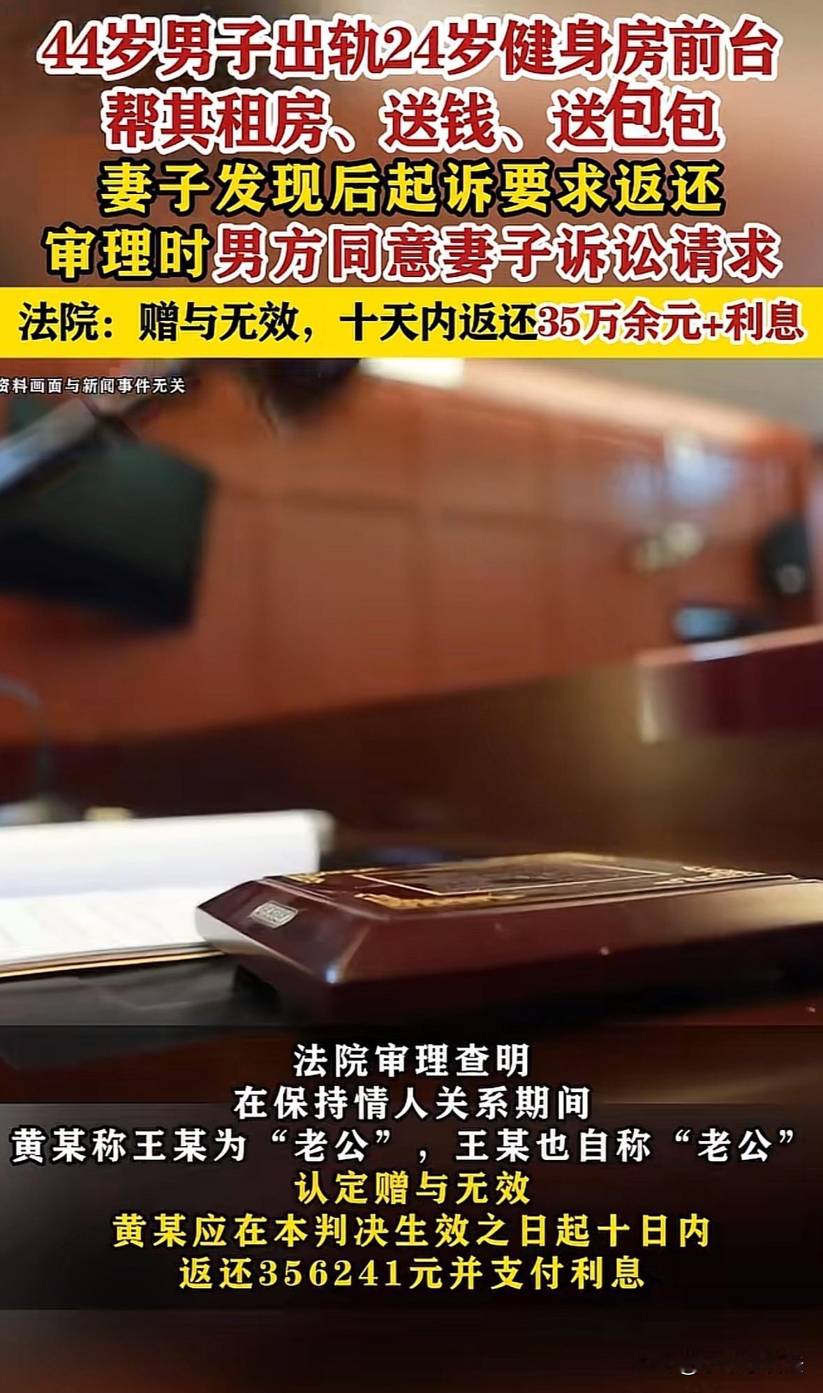 上海,44岁男子在健身房结识24岁女子,女子知晓男子已婚,但还是与其交往,并接受男子的赠与钱款。不久后男子妻子发现二人关系,起诉男子和女子返还46万元赠与钱款,男子在法庭上同意妻子的诉讼请求,并认可妻子主张的事实与理由,法院最后这样判决。 44岁王某与24岁黄某的一段不该有的恋爱关系被发现后,结局无非就是断绝关系。但是王某被发现后的操作,让人匪夷所思。 2023年10月,44岁的王某到某健身房锻炼身体,正好健身房的前台换了新人,是24岁的四川达州姑娘黄某,人长得乖巧可人,说话又温柔细腻,王某看一眼就记住了黄某。 从那之后,王某到健身房锻炼的次数增加,但大部分都是为了追求黄某才来到的健身房。 黄某也知道王某家里有妻室,但是并没有拒绝王某的追求,反而在不久后就答应和王某在一起。 王某为表示真心,出资给黄某租了一套房子,一来是用于黄某的居住,二来两个人可以经常在出租屋里见面,但是王某从不留宿,每天都会回家。 王某本以为这样家里家外的日子会一直过下去,不会被发现。却不曾想在2025年初,他和黄某的关系就被妻子魏某发现。 关系被魏某发现后,王某就开始疏远黄某,对于黄某的电话和信息一概不接不回。黄某也大概猜出来发生了什么事情,也没有再联系王某。 事情过去2个月后,王某主动提出与黄某断绝关系,黄某也没有觉得有多么的诧异,毕竟早就已经猜到了可能。 但是分手的同月,黄某就接到了王某妻子魏某的起诉,魏某要求黄某和王某归还钱款,是交往13个月里王某给黄某转账的那部分钱款。 魏某自从得知王某在外面还有一个24岁的小姑娘后,就开始调查王某给黄某花了多少钱。 黄某租房子是王某付的钱,黄某买的鞋子、包包、手镯等,也是王某通过微信或银行卡转账方式赠与给黄某的,前前后后加一起共计有467913元。 转账数额如此之大,而且都是在魏某不知情的情况下发生的,魏某认为该转账行为已经侵犯了她的合法权益,所以起诉黄某归还,并且起诉书上还有王某的名字存在。 根据《民法典》第1062条的规定:夫妻在婚姻关系存续期间所得的下列财产,为夫妻的共同财产,归夫妻共同所有: (一)工资、奖金、劳务报酬; (二)生产、经营、投资的收益; (三)知识产权的收益; (四)继承或者受赠的财产,但是本法第一千零六十三条第三项规定的除外; (五)其他应当归共同所有的财产。 夫妻对共同财产,有平等的处理权。 魏某认为,王某未经她的允许,将婚后的夫妻共同财产转账给黄某,侵犯了魏某的合法权益,王某应该将钱款退还回来。 而黄某在已知王某已婚的情况下,还和王某交往,并接受属于夫妻共同财产的赠与款项,该赠与行为应属于无效。 根据《民法典》第8条的规定:民事主体从事民事活动,不得违反法律,不得违背公序良俗。 并且黄某与王某的关系本就属于违背了公序良俗,根据规定,违背公序良俗的行为应属无效,所以王某给黄某的转账也应属于无效赠与。 根据《民法典》第153条第2款的规定:违背公序良俗的民事法律行为无效。 对于无效赠与,黄某应该进行归还。 魏某统计过王某赠与给黄某的钱款总数为467913元,法院最终认定只有356241元为无效赠与。 法院经过审理后认为: 根据《民法典》第1043条的规定:家庭应当树立优良家风,弘扬家庭美德,重视家庭文明建设。 夫妻应当互相忠实,互相尊重,互相关爱;家庭成员应当敬老爱幼,互相帮助,维护平等、和睦、文明的婚姻家庭关系。 黄某和王某在交往期间,黄某称王某为老公,而王某也以老公自居,王某违法夫妻忠诚义务,并擅自处置夫妻共同财产,其行为侵犯了魏某的合法权益。 黄某和王某之间的关系违背了公序良俗,因此王某在交往过程中赠与给黄某的钱款就属于违背公序良俗的无效赠与行为,理应进行返还。 黄某未作答辩,反而是王某在法庭上义正言辞的表达了自己的辩解。 王某同意妻子魏某的诉讼请求,并认可一切的事实依据和理由,并无异议。 法院最终判决,确认王某赠与给黄某的356241元的行为无效,黄某应将该笔赠与归还给魏某,并支付利息。 同时判定,案件受理费、财产保全费共11164.66元,由魏某负担2679.66元,黄某负担8485元。 偷鸡不成蚀把米,违背公序良俗原则的关系始终见不得光,到头来还是会回到原点,甚至还会赔付更多,希望黄某经过这件事能够认清事实,也认清人。