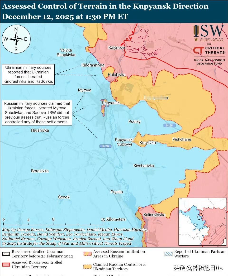 乌克兰军队近期在库皮扬斯克方向发起战术反击,解放了包括库皮扬斯克市部分地区在内的领土。乌克兰第二哈尔蒂亚军于12月12日报告称,乌克兰军队成功发动反击,稳定了库皮扬斯克方向的局势,解放了金德拉希夫卡和拉德基夫卡(均位于库皮扬斯克北部)及其周边森林,解放了库皮扬斯克北部地区,并突破至奥斯基尔河,切断了俄军通往库皮扬斯克地区的地面交通线。乌克兰第二军表示,截至12月12日,乌克兰军队已在库皮扬斯克包围了约200名俄军。12月12日,乌克兰总统泽连斯基在库皮扬斯克西南郊的P-07库皮扬斯克-舍甫琴科公路沿线发布了一张自己的照片,表明乌克兰军队已将俄军从该地区大幅击退。12月12日发布的地理定位视频也显示,乌克兰军队在库皮扬斯克全境展开行动。其他俄罗斯和乌克兰消息来源也证实了乌克兰的反击。据一位与乌克兰军事情报部门有关联的消息人士称,乌克兰军队包围了库皮扬斯克境内的俄军,肃清了库皮扬斯克西北部,并解放了米罗韦、金德拉希夫卡和拉德基夫卡。该消息人士指出,俄军仍然控制着霍卢比夫卡(位于库皮扬斯克北部)。一位俄罗斯军事博主声称,乌克兰军队开始从米罗韦(位于库皮扬斯克西北部)和拉德基夫卡渗透到库皮扬斯克西北郊区,这表明乌克兰军队也解放了米罗韦。该军事博主指出,俄军并未控制库皮扬斯克东部,而且流经库皮扬斯克的奥斯基尔河阻碍了俄军进入库皮扬斯克中部地区的行动。其他俄罗斯军事博主则声称,乌克兰军队发动了反击并取得了一些进展,但他们否认了所观察到的乌克兰军队推进的规模。乌克兰联合部队特遣部队于11月16日报告称,他们已开始努力阻止俄军在库皮扬斯克方向的推进,而这些近期的进展很可能是持续数周夺回库皮扬斯克行动的结果。