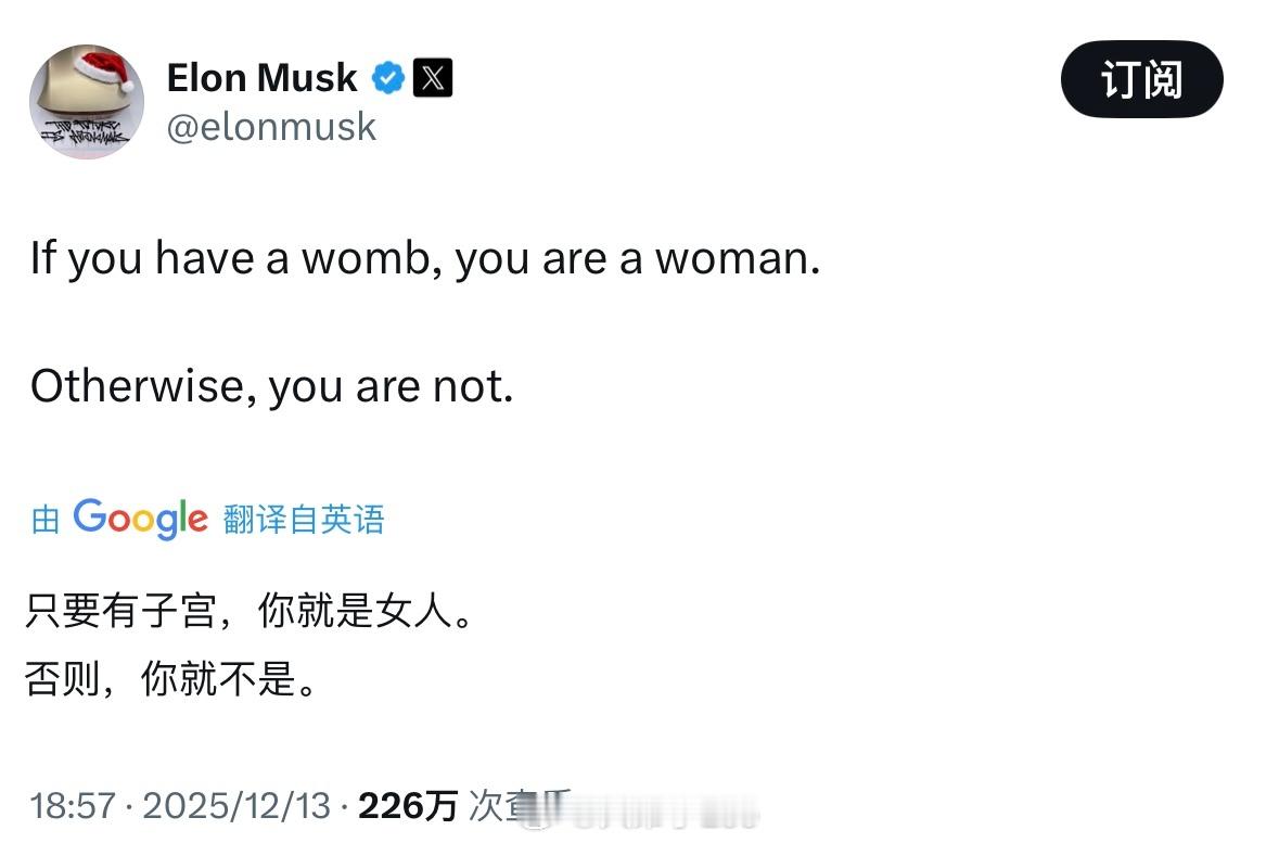 马斯克:有子宫,就是女人;否则就不是