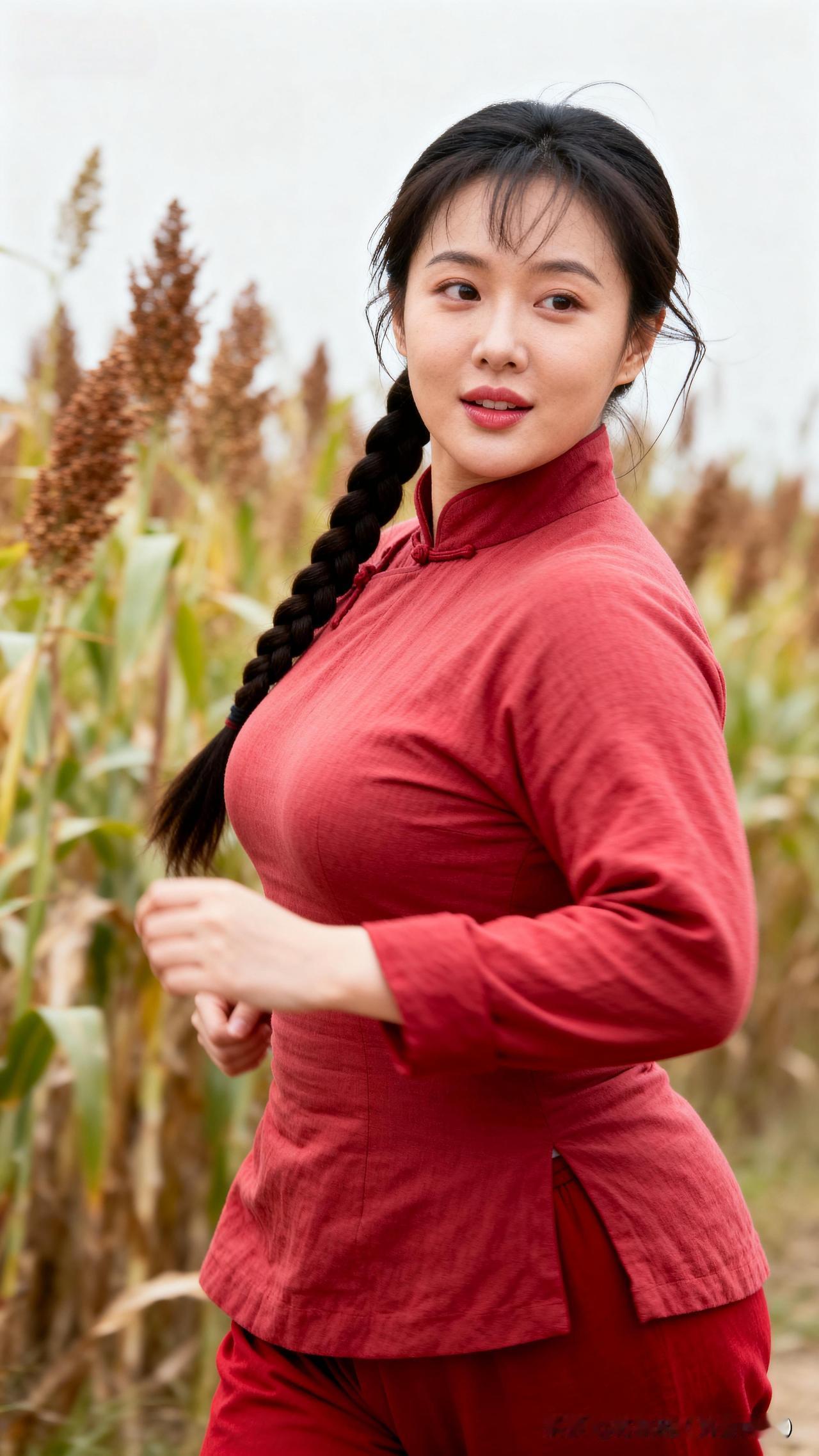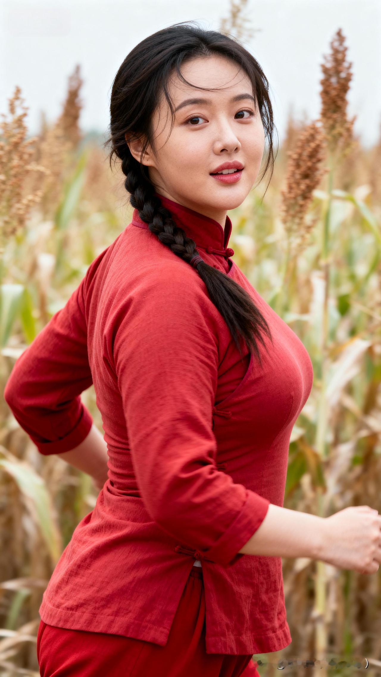 红高粱里的红姑娘 红衫曳地,辫梢缠风,高粱地里的一抹艳红,是刻在骨血里的鲜活与热烈。风掀动衣袂,也掀动着那份未经雕琢的生命力,像熟透的红高粱穗,饱满又带着野气,把乡土里的美揉成了最动人的模样。 ——我是苏晓冉,为AI立心。