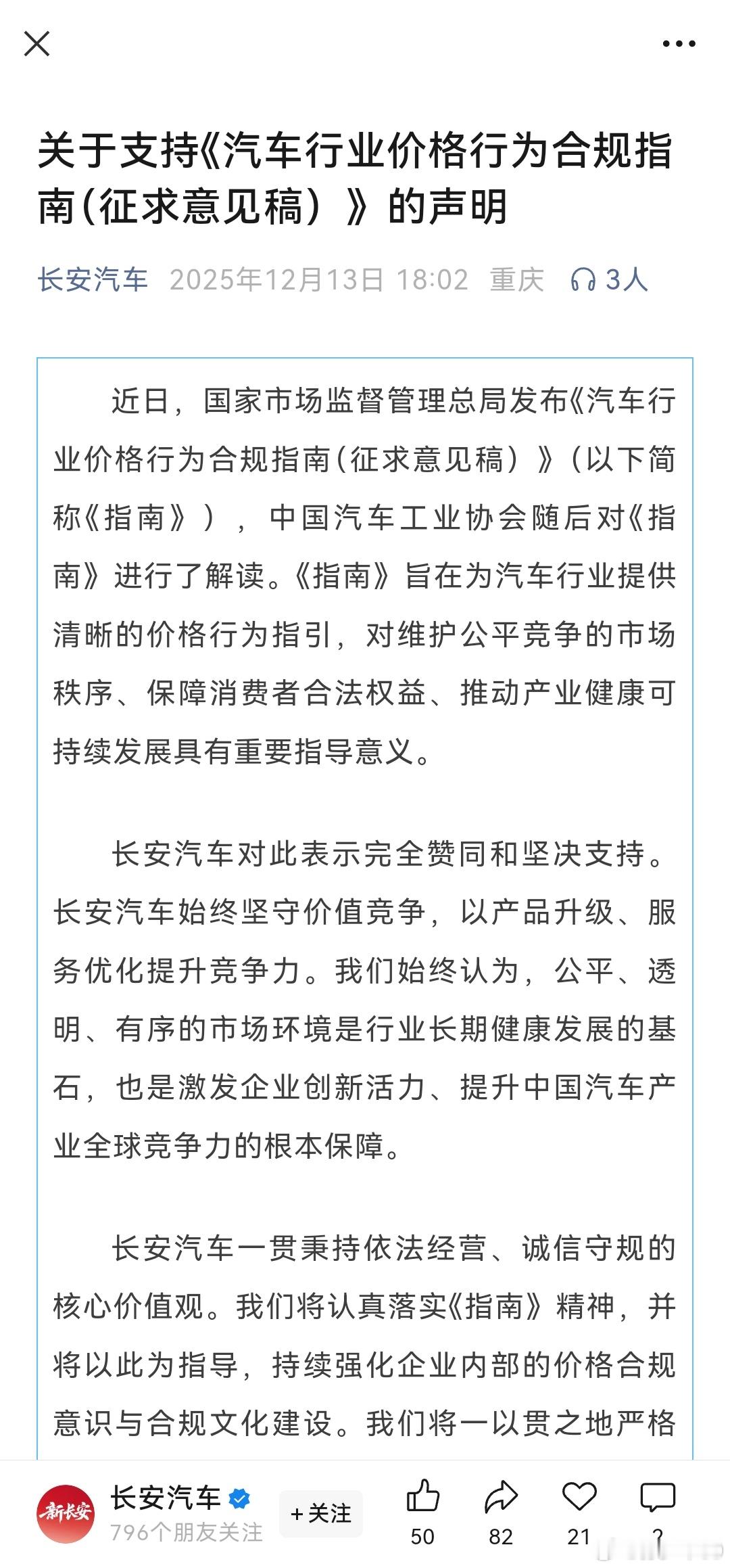 长安和北汽也发布了支持《汽车行业价格行为合规指南(征求意见稿)》声明