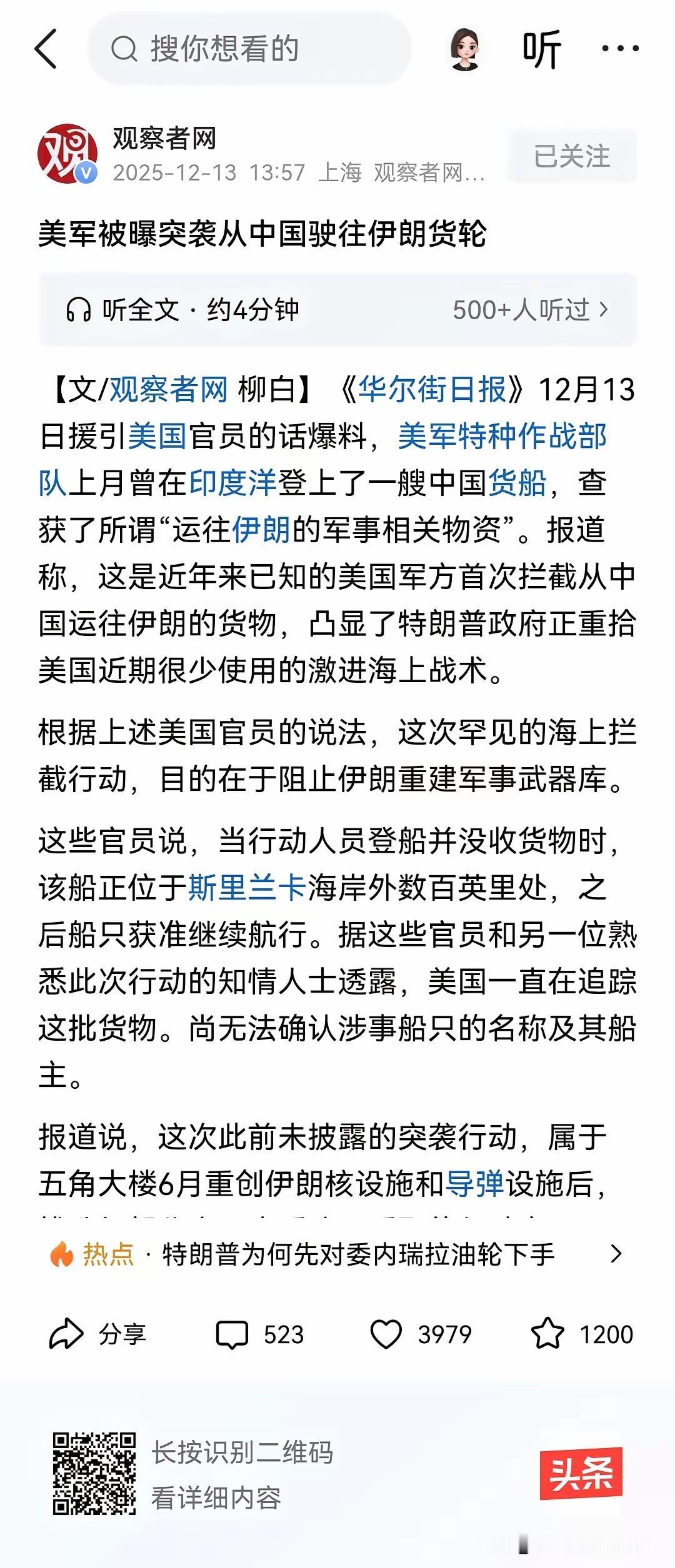 美军特种兵强行登陆从中国驶出货轮,美媒披露具体细节和原因。 观察者网消息,美国官员披露消息称,美军特种兵和普通部队上个月强行登陆中国货轮,并且扣押了部分物资,然后才放行中国货轮。 《华尔街日报》12月13日证实了这个消息,称美国官员披露的这个消息,并且是依据相关情报采取的扣押行动。 还直言这种扣押他国货轮的操作极为罕见,更是美军首次针对中方货轮出手,其挑衅意味不言而喻。 美媒披露的细节更是尽显美军的蛮横霸道,当时这艘中国货轮正航行至斯里兰卡海岸外数百英里的公海区域,毫无防备之际。 美军特种兵与普通部队协同突袭,强行登上货轮后,直接用枪支对准船员和水手,凭借武力胁迫对货轮展开全面搜查,全程充满压迫感。 搜查结束后,美军特种兵带走船上部分货物,才允许货轮继续按原航线航行,这般明火执仗的操作,与海盗行径无异,彻底突破了国际公海航行的基本准则。 至于美军贸然出手的原因,美媒披露是源于所谓的情报支撑,核心指向伊朗相关物资。美国官员对此说法不一,有官员称被扣货物包含伊朗常规武器所需零部件,已被美军当场销毁。 另有官员直言货轮所载物资与伊朗导弹采购计划相关。说到底,美军此次扣押中国货轮,本质是借拦截伊朗相关物资之名,行霸权干涉之实。 美国长期对伊朗实施单方面制裁,为了遏制伊朗,竟肆意将手伸向公海,拦截他国正常航行的货轮,这种将自身制裁政策强加于他国的做法,本身就是对国际规则的公然践踏。 中方货轮从事正常国际贸易运输,美军仅凭单方面情报就强行登船搜查扣押,既没有合法依据,更是对国际航运秩序的粗暴破坏,哪有半点大国该有的责任与担当? 这并非特朗普政府近期首次在公海肆意妄为,此前其已在委内瑞拉周边海域连续击沉渔船、潜艇等船只,全程未经过联合国批准,完全是凭一己意志发起的单方面行动,霸权野心暴露无遗。 此次针对中方货轮出手,更是将其激进姿态推向新高度,毕竟这是美军首次拦截中方货轮,足以看出特朗普政府在对外行动上愈发肆无忌惮,毫无顾忌国际社会的看法。 当下美国奉行的是战略收缩与霸权扩张并行的双重策略,看似在部分区域收缩力量,实则在核心利益领域愈发强势,凡事只以自身意志为转移,国际法与国际规则在其眼中形同虚设。 只要不符合自身利益,就随意打破规则、任性妄为。值得注意的是,此次行动全程由美媒披露,美军自始至终未公开出面澄清相关情况,这般沉默恰恰印证了其心虚。 美军明知此次行动缺乏合法依据,违背国际公序良俗,担心公开回应会引发更大舆论反弹,遭到国际社会谴责,只能任由消息通过媒体传播,试图模糊焦点。 但事实摆在眼前,美军的霸道行径早已深入人心,此次强行登检中国货轮,不过是其破坏国际秩序的又一铁证。 在全球化时代,国际航运秩序关乎各国利益,公海航行自由受国际法保护,任何国家都无权随意干涉。 美国却凭借自身军事优势,在公海横行霸道,随意拦截他国货轮,这种做法不仅会加剧国际局势紧张,还会严重冲击全球供应链稳定,给全球贸易往来带来安全隐患,已然成为全球最大的不稳定因素。 美军此次的蛮横操作,不仅伤害了中美之间的互信,更让国际社会看清了美国霸权的真面目。 所谓的“维护地区安全”不过是借口,实则是为了自身霸权私利,肆意侵犯他国权益、破坏国际规则。 国际社会也该清醒认识到美国霸权的危害性,携手抵制这种规则破坏行为,共同守护全球秩序的稳定。 美国若继续沉迷霸权,无视国际规则肆意妄为,终将遭到反噬,失去国际社会的信任与认可。 毕竟时代早已不同,单边霸权行不通,唯有遵守规则、尊重他国权益,才能实现互利共赢,这是大势所趋,更是人心所向。 美军的心虚与沉默改变不了侵权的事实,其霸权行径注定会遭到全世界的抵制与谴责,全球秩序的稳定绝不容许个别国家肆意破坏。 消息来源:观察者网