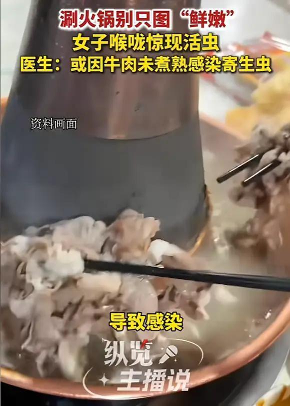 “太吓人了!”据媒体12月13日报道,湖北襄阳,一女子吃火锅时,觉得牛肉煮太久了不新鲜,于是在锅内涮了几秒就拿出来吃,吃完后,觉得嗓子不太舒服,还有刺痛感,于是去医院检查,没想到结果显示她喉咙里面竟然有一条活虫!网友:再也不吃三分熟了! 现在很多人吃火锅都讲究一个“嫩”,觉得肉煮久了就柴了,失去了入口即化的口感,所以都会效仿“七上八下”的吃法,涮几秒就出锅。 马女士也是这么想的,她总觉得煮久了的牛肉就不新鲜、不好吃了,于是每一片肉都只在滚烫的汤底里草草涮了几下,看着红肉刚泛白,甚至还带着点红血丝,就迫不及待送进嘴里,吃的时候只觉得肉质滑嫩,特别满足。 可吃完没多久,不适感就找上门了。一开始只是喉咙里有点异物感,像是卡了东西,还有点刺痛,马女士以为是吃了太辣的东西上火,或者不小心被骨头渣划伤了,就猛灌了几口水,想着忍一忍就过去了。 但没想到,这种感觉不仅没消失,反而越来越强烈,甚至能清晰感觉到喉咙深处有东西在轻轻蠕动,那种头皮发麻的触感,让她实在忍不住,只能深夜赶紧去医院求助。 接诊的医生听完马女士的描述,也觉得有些奇怪,赶紧用仪器探入她的咽喉深处检查。 结果这一看,连见多识广的医护人员都倒吸了一口凉气——内窥镜的镜头下,一条活生生的虫子正在她的喉咙里蠕动着,看着特别令人作呕。 好在医生经验丰富,小心操作后,把这只“不速之客”完整取了出来。 经过鉴定,这是一只阔盘吸虫的成虫,这种虫子正常情况下都长在牛羊等家畜身上,极少会出现在人体内。 看到鉴定结果,马女士吓得脸都白了,怎么也没想到,自己只是想吃口嫩牛肉,竟然把寄生虫吃进了肚子里。 其实这一切的祸根,就是她那“涮几秒就出锅”的吃法。很多人都以为,冷冻过的牛肉卷就不会有寄生虫了,或者觉得滚烫的火锅汤能瞬间杀死细菌和虫卵,但事实根本不是这样。 冷冻切片并不能百分百消灭所有寄生虫和虫卵,而短短几秒钟的焯烫,肉的核心温度根本达不到杀菌杀虫的标准,顶多就是给寄生虫做了个“温水浴”,不仅没把它们烫死,反而让它们顺利进入了人体,找到了新的宿主。 不过也算是不幸中的万幸,这只阔盘吸虫只是停留在马女士的咽喉部位活动,没有顺着食道钻进肝脏或者其他内脏器官,不然造成的伤害可就不止是惊吓和喉咙刺痛这么简单了。 经过医生的及时治疗,马女士的身体已经没什么大碍,但喉咙里那条活虫蠕动的影像,恐怕会成为她一辈子的心理阴影。 这件事也给所有爱吃火锅、追求“鲜嫩”口感的食客提了个醒:舌尖上的美味固然重要,但健康和安全才是第一位的。 为了那几秒的滑嫩口感,就拿自己的身体做赌注,实在太不值得了。火锅汤底再烫,也需要足够的时间才能杀死肉里的寄生虫和虫卵,短短几秒的涮煮,根本起不到杀菌的作用。 现在很多人都喜欢吃三分熟、五分熟的肉类,觉得这样更能保留食材的鲜味,但殊不知,这种吃法背后隐藏着巨大的健康风险。 毕竟我们不知道这些肉类在生产、运输、储存的过程中,是否会受到寄生虫污染,与其冒着感染寄生虫的风险追求口感,不如多等几分钟,让肉在锅里彻底煮熟煮透。 下次再吃火锅,夹起牛肉卷、羊肉卷的时候,可千万别再着急了,让它在锅里多待一会儿,煮熟煮透再吃,才是最稳妥的选择。