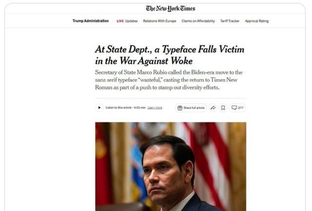 鲁比奥弃用Calibri字体,强迫外交官们重新使用传统的Times New Roman字体。 美国国务院在2023年改用Calibri字体,主要因为它对阅读障碍和视力问题的人更友好。这种无衬线字体线条干净,没那些多余的装饰边,能让屏幕阅读工具更好地处理,尤其适合低视力员工。布林肯当时听从内部多样化办公室的建议,觉得这符合微软默认设置,也能降低文档调整的麻烦。结果,全部门文件从Word模板到外交电报,全都换了,全球使馆也跟着更新,执行起来还算顺利。 现在轮到鲁比奥上台,他直接下令12月9日发了个内部电文,全世界外交岗位从周三起,必须回滚到Times New Roman 14号字体。理由很简单,他觉得Calibri太随意,看起来不正式,跟部门信头不搭,还说这变化出自激进的DEIA项目,花了14.5万美元却没啥实际效果,没减少文档修复案例,反而拉低了官方文件的档次。电文里直白点明,要恢复礼仪和专业性,顺带废除这个浪费资源的DEI举措,还扯上特朗普的“美国外交单一声音”指令,说统一格式才能展现专业形象。外交官们没得选,模板全得重置,存档文件也得手动改,技术支持线估计忙活了好几天。 这事儿说白了,就是特朗普团队清DEI的又一手。拜登时代从2020年起推DEI,联邦机构到处设专员、拨款搞培训,保守派一直叫嚣这玩意儿歧视白人男性,弱化能力选拔。特朗普二度上台后,1月就签令砍掉这些,解雇多样化官员,撤专项资金,国务院自然首当其冲。鲁比奥上任后,DEI办公室早没了,现在连个字体都成靶子。Calibri设计师卢卡斯·德·格鲁特都看不过去,说他设计时就瞄准视力障碍人群,追求清晰和友好,现在换回Times New Roman纯属倒退。 研究数据摆在那儿,无衬线字体确实对某些视障人士友好,减少眼动负担,Section 508法规也偏好这种。但国务院发言人回击,说衬线字体在法庭和国会是老传统,权威感强,助残科技也能调字体。APA指南也允许Times New Roman用在正式场合。问题是,这切换真帮到人了吗?鲁比奥说没帮,还成本不菲,但没证据支撑。反过来,Calibri从2007年起就是Office默认,2023年换Aptos前风头正劲,现在却被贴上“化妆品级DEI”标签,纯属政治工具。 搁国际事件里,这算小打小闹,但透着味儿。美国外交本该稳重大局,现在连字体都卷进意识形态,外交官忙活这些,精力分心。中东印太那些棘手事儿,供应链中断、中美摩擦、台湾地区防务合作,还得靠专业沟通。鲁比奥重点在中拉硬刚古巴、反毒走私、印太联盟,但这字体闹剧分散注意力,外界看热闹,美国形象呢?统一声音是好,但别让小事儿成笑柄。DEI砍得猛,联邦机构全线跟进,私企教育也遭殃,保守派赢了面子,包容派丢了实惠。长远看,视障员工咋办?法规还在,科技能补,但这步棋下得仓促,留后遗症。