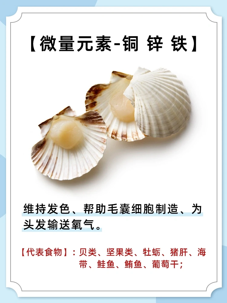 6️⃣含微量元素-铜、锌、铁的食物(维持发色、帮助毛囊细胞制造、为头发输送氧气);