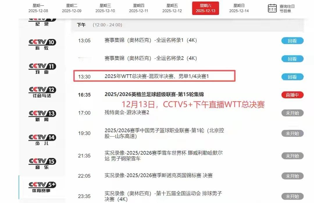 调整!13日晚间中央5台直播WTT总决赛混团决赛有变,莎头大战韩国北京时间12月13日,WTT香港总决赛倒数第2个比赛日,赛事也进入到了最后阶段,三个项目的冠军这两天相继诞生!国乒提前包揽女单4强,拿到了冠亚军,成绩很出色,陈熠和蒯曼这两名小将发挥给力!男单方面,王楚钦、林诗栋顺利晋级4强,两大国乒世界冠军争取在决赛会师,他们在半决赛的对手分别是莫雷加德、张本智和,预计比赛会很激烈,希望大头和小石头顶住压力,不管是莫雷加德还是张本智和,都具备夺得奖牌的实力,国乒不能大意!混双决赛已经出炉,王楚钦/孙颖莎VS林钟勋/申裕斌!在半决赛,国乒对阵外协会遭遇混双首败,林诗栋/蒯曼1-3不敌林钟勋/申裕斌,这场有点可惜了,在大比分领先的情况下被逆转,动漫组合虽然世界排名第1,但进步的空间还很大,他们二人被寄予厚望,可能会代表中国队参加2028年洛杉矶奥运会混双比赛!整体来看,国乒的发挥达到预期,除了提前夺得女单冠亚军之外,男单也有望包揽金牌和银牌,混双夺冠的希望同样很大,理想的情况下,国乒在WTT总决赛将取得3金2银的成绩!12月13日晚间的赛程安排已经出炉,两场女单半决赛相继开打,都是国乒内战,孙颖莎和王曼昱会师决赛的概率更大,毕竟她们二人代表了当今女子乒坛的最高水平!在女单结束后,就是万众瞩目的混双决赛,WTT总决赛首金诞生,莎头组合决战韩国的林钟勋/申裕斌,需要早早进入比赛状态,不过孙颖莎打完女单半决赛就要打混双决赛,对体能是比较大的考验,希望莎莎能经受住挑战,帮助国乒拿到这枚宝贵的金牌!中央5台的直播安排也进行调整,今天白天的WTT总决赛比赛,由CCTV5+负责转播,而晚间的女单半决赛和混双决赛,则是由CCTV5转播,不再是CCTV5+!比赛时间从19点30开始一直持续到21点00,大家记得准时观看!
