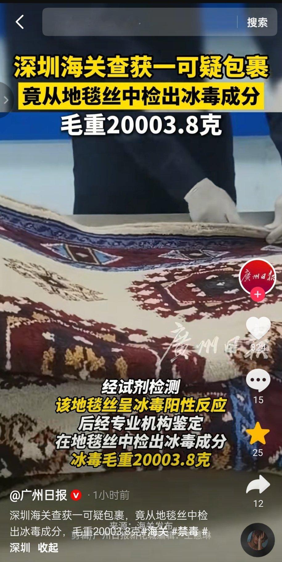🔻广州日报:深圳海关查获一可疑包裹,竟从地毯丝中检出冰毒成分,毛重20003.8克。热点现场