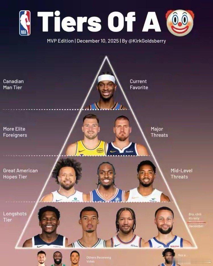 NBA专家给本赛季MVP分档:第一档:亚历山大第二档:东契奇、约基奇第三档:康宁汉姆、马克西、米切尔第四档:华子、文班、布伦森、库里仅以本赛季球员的表现来看,文班亚马和库里的出勤率太低,或许没办法列入第四档的范围。更合适的人选会是字母哥,甚至杜兰特或申京。他们的出勤比文班和库里高,个人数据也不差,尤其是杜兰特和申京,带队成绩高居西部第二,亦或者凯尔特人的杰伦布朗,带着没人看好的阵容,获得东部第三,无论如何都比文班和库里更合适。这位By的数据专家Kirk Goldsberry,看上去个人偏好还是太重了。