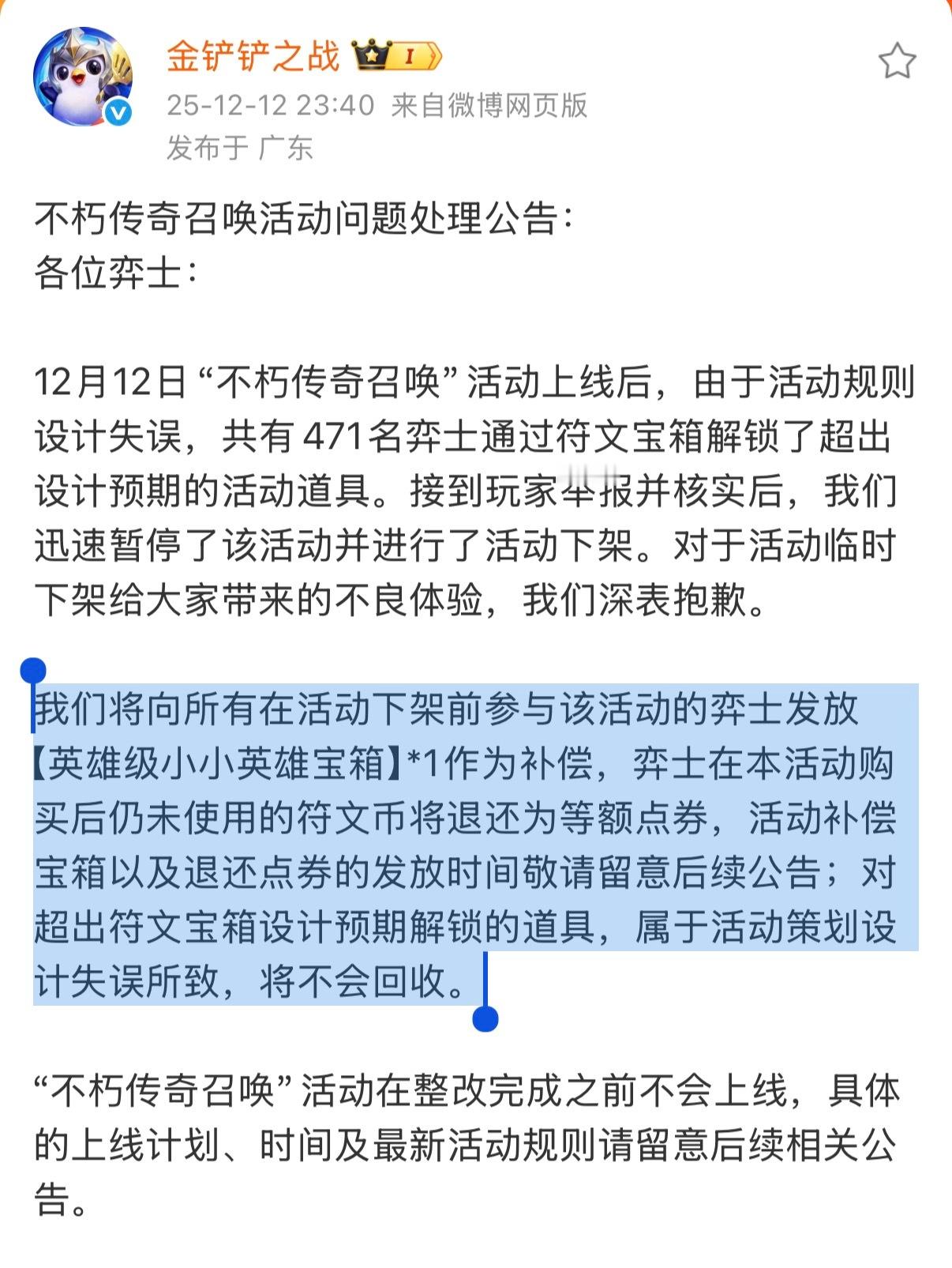 给大家总结一下事情的来龙去脉:金铲铲官方在12月12日上线的池子,玩家可通过抽奖把池子里面的小垃圾抽完『大约花费600-3000R,以账号实际情况而定,最高不超过3000R』抽完所有池内无价值的后每十连(60R)必出神话/至臻(原保底价值600/2200)品质皮肤12日凌晨上线活动几分钟后,有玩家发现此漏洞,主播下场直播次次出金,大约一小时后金铲铲官方发现漏洞,下线了此次活动此次活动经计算,最少花费5000元可获得价值10w游戏账号,游戏账号一夜凭空缩水至少十倍,氪金玩家利益受到严重损害。12日晚,金铲铲官方回复:此次活动异常账号只有471个,且对所有参与此次活动玩家给予补偿『英雄级小小英雄箱子』