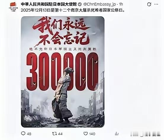 牢记历史,珍惜和平——东方大国驻日大使馆发文:2025年迎来第十二个南京大屠杀死难者国家公祭日。 2025年,迎来第十二个南京大屠杀死难者国家公祭日。驻日大使馆在12月13日发文称,每年这一天的意义,铭记30万遇难者的苦难,在历史的天空划下永不磨灭的印记。南京大屠杀的真实经历,“我们看见那些尸体,就像堆草一样。”那些幸存者们,用颤抖的声音,讲述他们亲眼所见的惨状。30万遇难者的苦难,不仅仅属于他们自己,更属于全世界。讲述他们的,不仅仅是东方大国,还有西方人。西方人见证了南京大屠杀,他们用相机记录下这一切,用文字描写这场人间地狱。他们的见证,无法被任何人否定。日本部分势力试图篡改历史,否认南京大屠杀,但是,他们无法抹去真实的历史。每年这一天,讲述这段历史,是为了警惕后代;每年这一天,重温这段经历,是为了保持清醒。我们铭记这段历史,是为了不让悲惨重演,是为了珍惜如今的和平生活。如今,和平降临在这片土地上,但是,和平并非天然,而是建立在强大的基础之上。只有国家强大,才能守护这份和平。