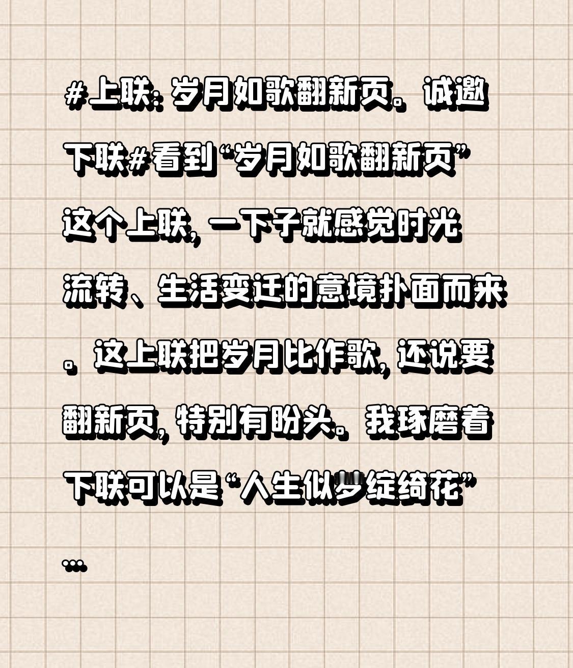 看到“岁月如歌翻新页”这个上联,一下子就感觉时光流转、生活变迁的意境扑面而来。这上联把岁月比作歌,还说要翻新页,特别有盼头。 我琢磨着下联可以是“人生似梦绽绮花”。人生就像一场梦,充满了未知和惊喜,“绽绮花”寓意着在人生旅程里能绽放出绚丽的花朵,就像岁月翻开新篇章后会有新的美好。当然啦,像“山河若画入新诗”也是很不错的下联,把山河比作画,与岁月的歌相互呼应,诗意满满,将天地万物的美好与时光变迁融合在一起,简直绝配。