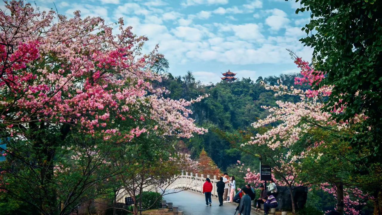 💚山是大地的画框,花是春天的颜料,行人在桥上走着,把自己也走成了这中式盛景里的一帧温柔。 ✨云絮在蓝天写着朦胧的诗,层林藏着岁月的故事,满树绯色花瀑下,人间烟火与山水灵秀正悄然相拥。