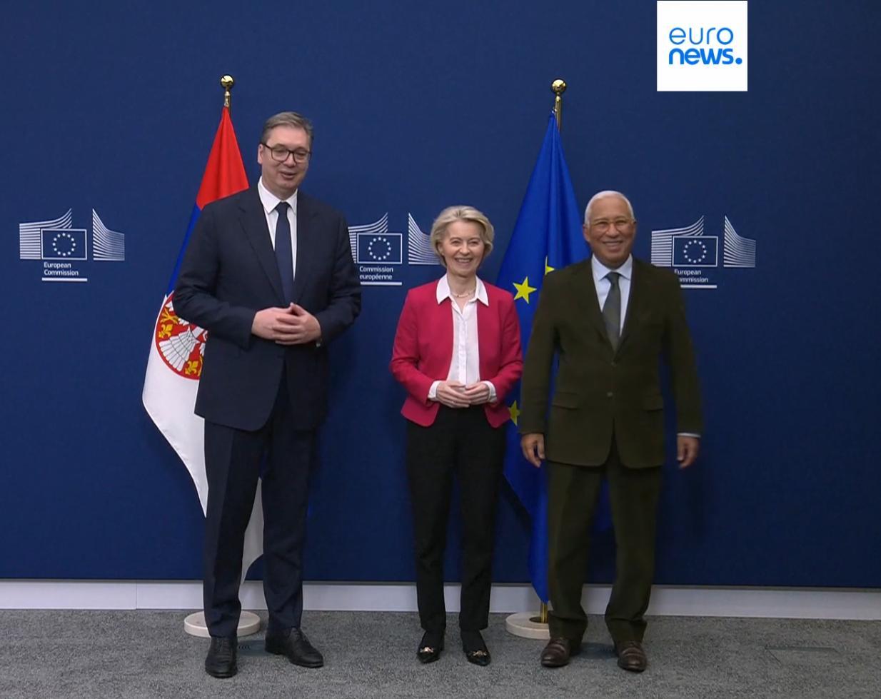 低头私语被记者录音,武契奇究竟向冯德莱恩透露了关于莫斯科的什么消息? 近日,塞尔维亚总统武契奇在比利时布鲁塞尔与欧盟官员会谈时,向冯德莱恩低语:“我刚收到莫斯科的消息……”,冯德莱恩立刻打断他,说了句“等一下”。这一对话被在场记者的麦克风意外捕捉。当时,欧洲理事会主席安东尼奥·科斯塔也在二人身旁,拍照结束后,三人一同离开。目前,武契奇所说的“莫斯科发来的消息”具体内容仍不明晰。