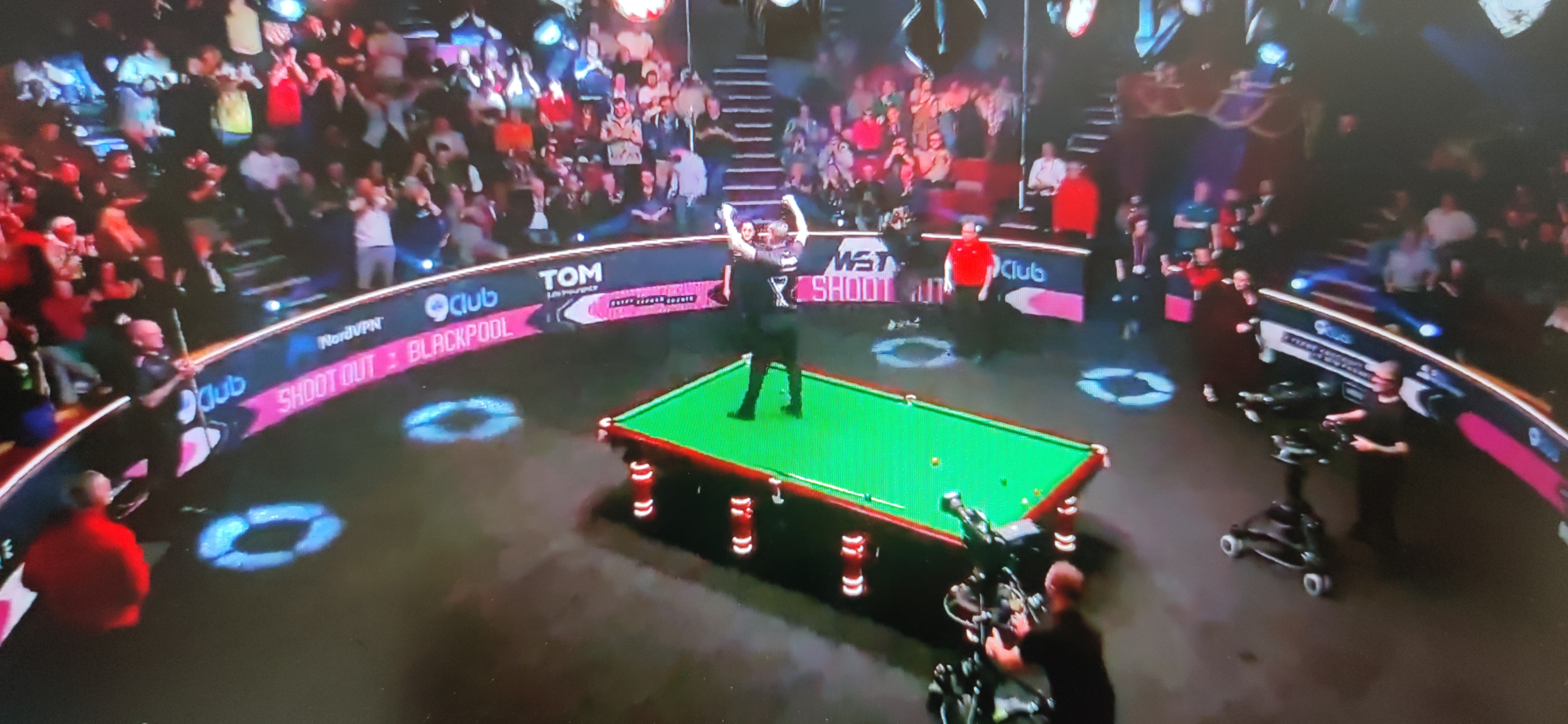 斯诺克单局限时赛决赛,伯顿赢得冠军后,跳上球桌庆祝夺冠。