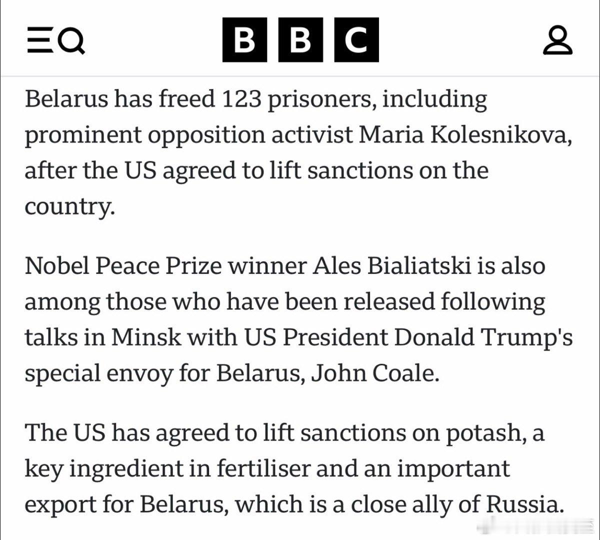 美国同意取消对白俄钾肥的制裁(🇧🇾重要收入来源)作为条件,123名政 zhi 犯(反对派领导人、诺贝尔和平奖获得者等)被释放,并立即离境