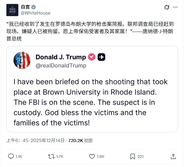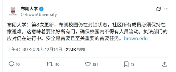 美国布朗大学发生大规模枪击事件,至少2人死亡,8人受伤,特朗普发文称嫌疑犯已被拘留,但是布朗大学官方账号发布消息称校园仍处于封锁状态,要求所有成员待在室内并锁好门窗。热点现场