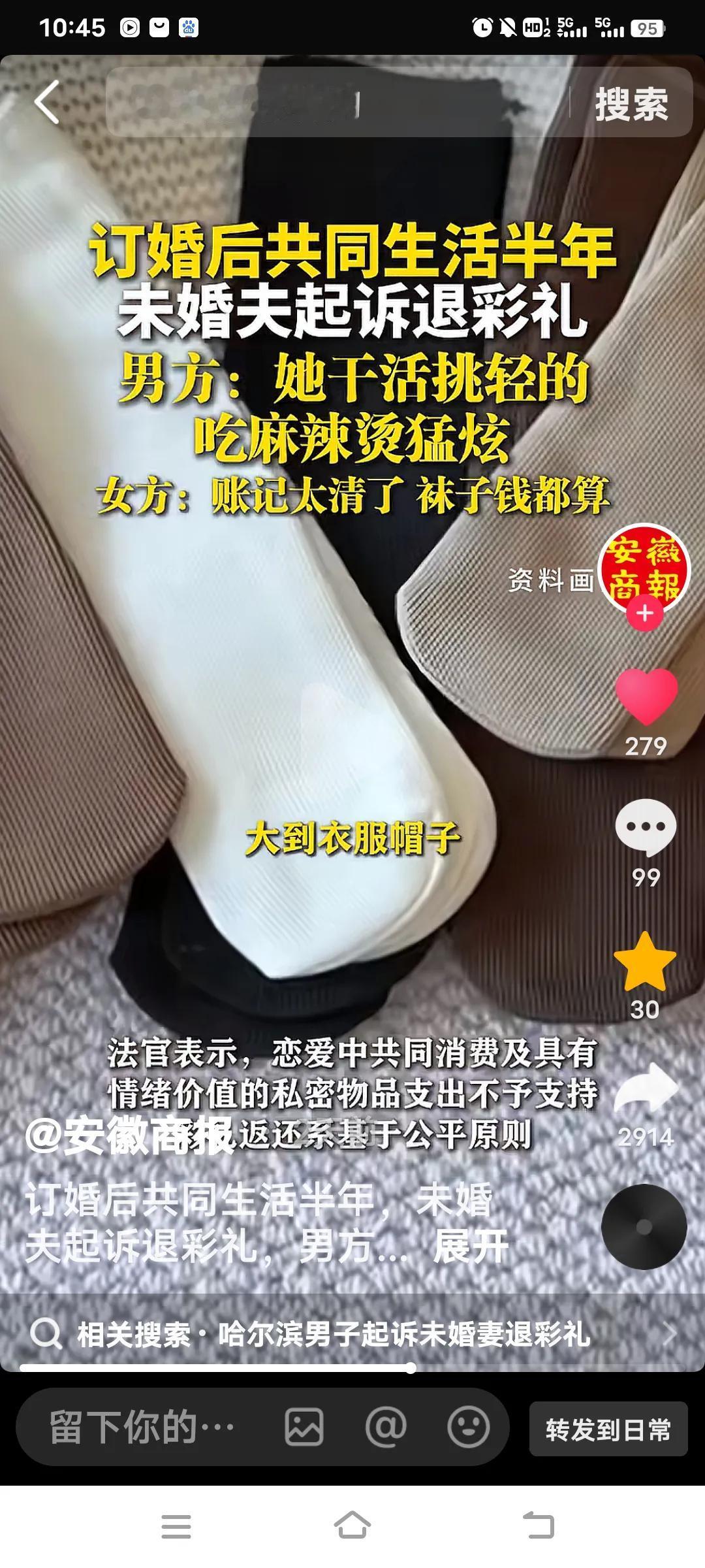 未婚夫起诉退彩礼的事儿还挺多,背后故事也各有奇葩! 黑龙江,哈尔滨一对小年轻情侣经媒人介绍俩人订婚。女方在男方麻辣烫店干了半年共同生活,男方给女方2万“头茬彩礼”。男方嫌女方“挑轻活,吃的还多”,对她态度冷漠。提出分手,闹到法庭。男方还想讨回3万恋爱开销,法院认定这属共同消费。最终2万彩礼女方返还1万,男方放弃诉讼。女方说男方对她算的太清了。连一双袜子都算上了。 按理讲男方觉得女方不合适提出分手,根本没有理由要彩礼了,认吃亏不要就是了。再说了在你那里干半年的活。没有功劳有苦劳吧。就是她干轻的,高低干了,抛开男女朋友不说就是找个帮工也得发工资啊!更别说共同开销的钱和2万元的彩礼! 无论是男是女都有涵养大小,一个大男的能说出这样的话,要是涵养大的随便一个理由就可以让女的自己走了。说到底这女的也没有心机,只是说他和她分的清一笔一笔的。 你怎么不知道动脑考虑一下,你没有闲着,到外面打工也得有工资白白搭了半年的青春和劳力,真不值得。个人观点,不喜勿喷。 这件事情大家怎么看?评论区里聊聊!彩礼谈崩后 彩礼纠纷 订婚退彩礼 彩礼司法解释