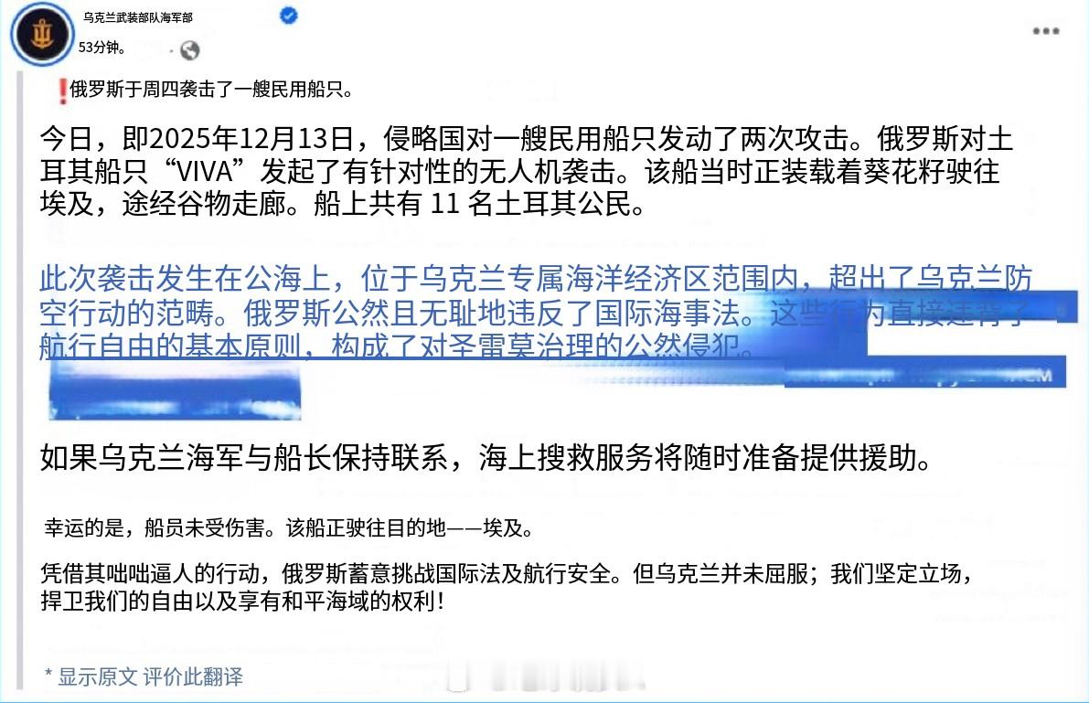 俄乌冲突 乌克兰海军强烈谴责俄罗斯打击敖德萨港口土耳其民用船只的流氓行为。不是,乌人记性不至于是七秒钟的鱼吧?前几天不是连续袭击了多艘所谓“俄罗斯影子舰队”的油轮么?轮到自己挨打港口被封锁时,就到处找青天大老爷了?玩不起可以不玩哈。俄称对乌发动大规模攻击 乌克兰敖德萨遭空袭