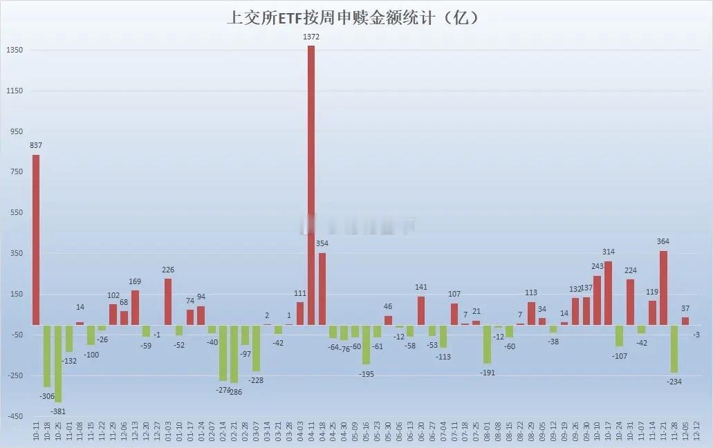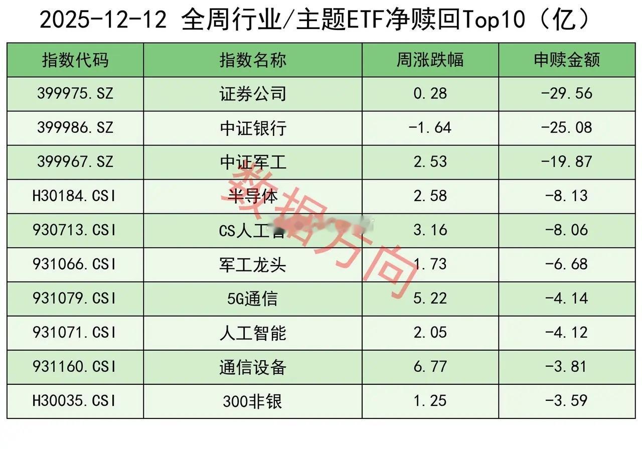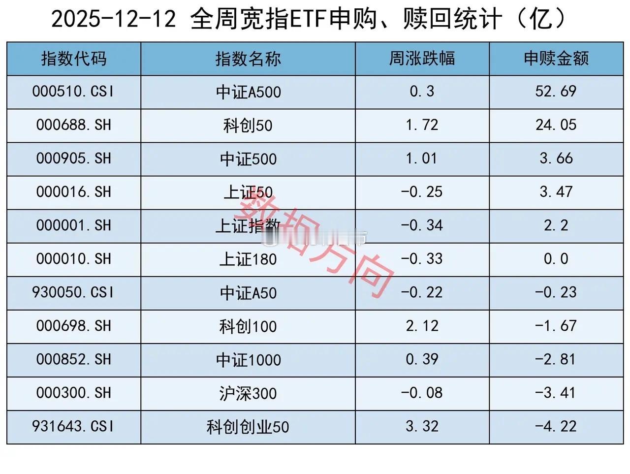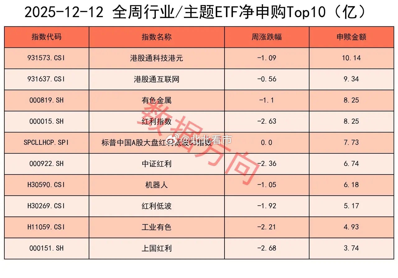 神秘资金流入三个方向本周,上证指数跌幅为0.34%,上交所股票型ETF净赎回3.44亿。金额小,大约是近一年以来单周净赎回最少的一次。五个交易日净申购、净赎回金额依次分别为:(-43.87亿)、(-53.29亿)、(-22.57亿)、29.15亿和87.13亿。上半周以赎回为主,下半周以申购为主。这是个特殊的时间节点,老美于当地时间周三、我们这边周四凌晨宣布降息25个基点。ETF申赎的操作方向在这个时候发生改变,不知道是不是巧合,还需要观察持续性。从各宽指的申赎情况来看:中证A500,本周获大幅净申购52.69亿。科创50指数,本周净申购24.05亿。中证500、上证50、上证指数等,本周获小幅净申购。科创创业50、沪深300、中证1000、科创100、中证A50等指数,本周被小幅净赎回。行业和主题申购榜港股通科技港元、港股通互联网,本周分别获得10.14亿、9.34亿净申购,合计19.48亿A股从11月14日开始调整,到现在已经整整一个月时间。相比之下,港股从10月初开始调整,到现在已经有两个多月的时间,调整的时间更长、调整的空间更大,从技术形态看已经接近5浪的尾声。港股有可能率先于A股企稳反弹。尤其是港股里面的这些互联网科技品种,基本面一如既往的好。有色金属、工业有色,本周分别净申购8.25亿、4.93亿,合计13.18亿本周,伦银、伦铜双双创出历史新高;周五,黄金再次逼近前高,之后随着美股的跳水而回落。东大用铜占全世界的58%,老美只占7%。偏偏,美资控制了世界上约6成的铜资源。他们一个劲的拉高价格,想让我们在高位接盘。之前老美曾狂拉比特币,结果东大没有上当。于是他们只能自弹自唱。铜是刚需,这个事情不会那么容易就过去。周末看到一则新闻,多家家用电器厂商,包括海尔、美的、海信、TCL、奥克斯、小米等,已联合推进空调“铝代铜”方案。这一行动旨在通过技术升级降低对铜资源的依赖,铜价波动较大时,铝材能帮助厂商控制成本并维持利润空间。红利指数、标普中国A股大盘红利低波50指数、中证红利、红利低波、上国红利,五大红利指数一起进入本周申购榜,合计净申购31.63亿本周,债市普遍小涨。红利ETF的周跌幅基本都在2%附近及以上,本来就不合理,更有相关股票比ETF的跌幅更大,于是大资金们看到了这里的套利机会。赎回榜证券公司、300非银,本周分别净赎回29.56亿、3.59亿,合计33.15中证银行,本周净赎回25.08亿中证军工、军工龙头,本周分别净赎回19.87亿、6.68亿,合计26.55亿CS人工智、人工智能,本周分别净赎回8.06亿、4.12亿,合计12.18亿5G通信、通信设备,本周分别净赎回4.14亿、3.81亿,合计7.95亿