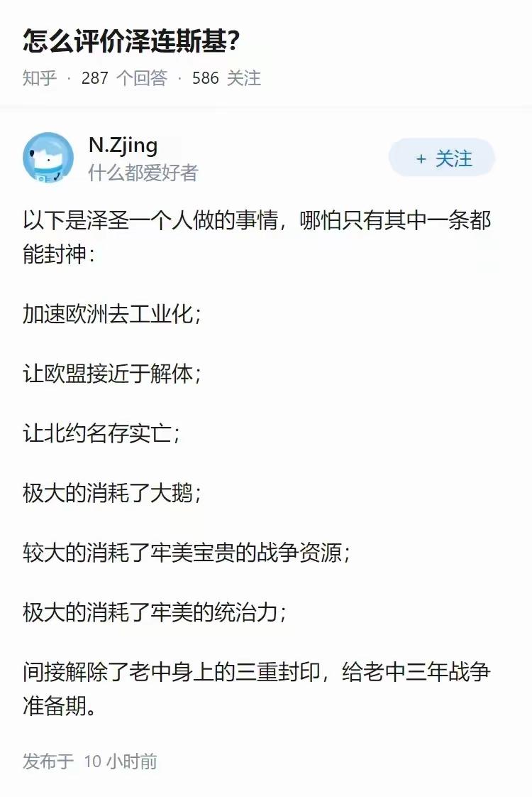 荣耀属于乌克兰,伟大属于泽连斯基,必须为其封圣! 泽圣,可不是中国网友白给他的封号。 别的不说,他领导乌克兰人民,以百万伤亡为代价,成功消耗了中国在全球的几大主要竞争对手——美国、俄罗斯和欧洲! 就凭这点,伟大的泽连斯基,必须封圣! 坚持到底,必须打到最后一个乌克兰人!