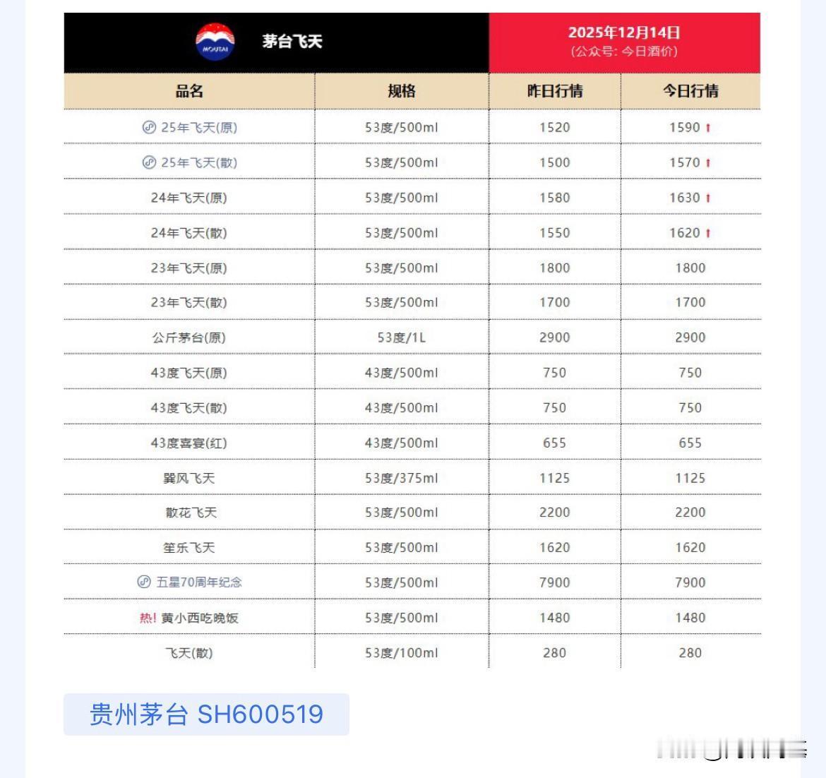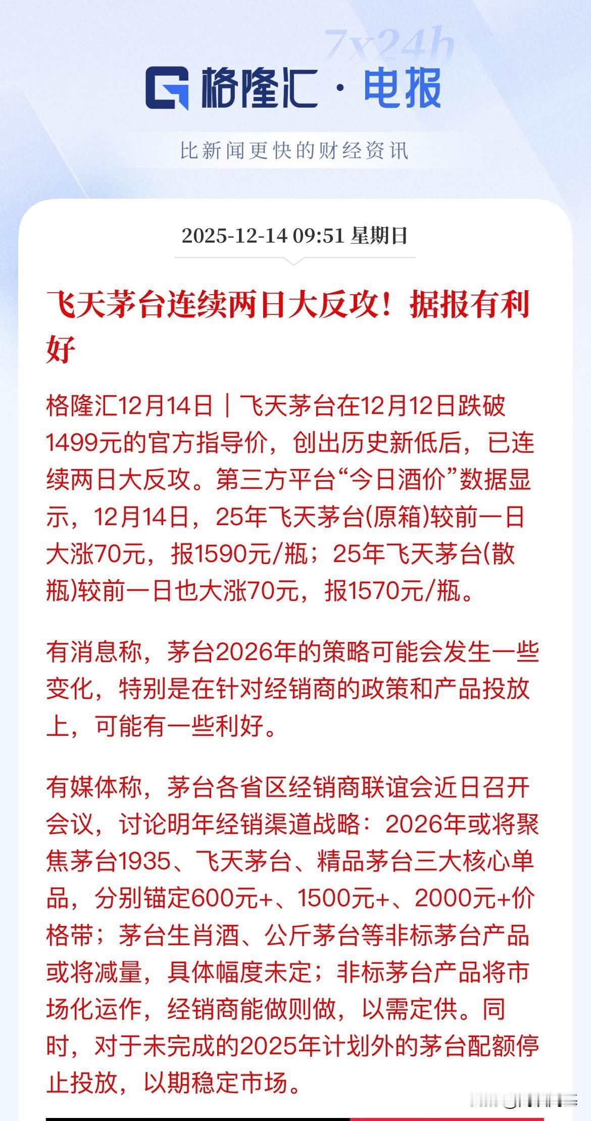 利好来袭,茅台酒价反扑了?今日酒价较前一日大涨70元/瓶,消息面上说茅台12月暂停经销商供货防恐慌性抛售以及改变2026年大幅削减非标 茅台股价持续走低,酒价也是在持续下挫回调,12月10日股价更是跌破1400元/每股,最低1383.18元每股,逼近6月底的1373元/股, 茅台在一年之内再度换帅,消息称2026年要采取控量来稳住价格,生肖-50%,15年/1L-30%,彩釉珍品停供,将聚焦飞天、精品、茅台1935三大核心产品, 随后茅台酒价和股价止跌回暖,就不知道这招能否短暂提振或者说修复市场信心和情绪,还是有待观察。