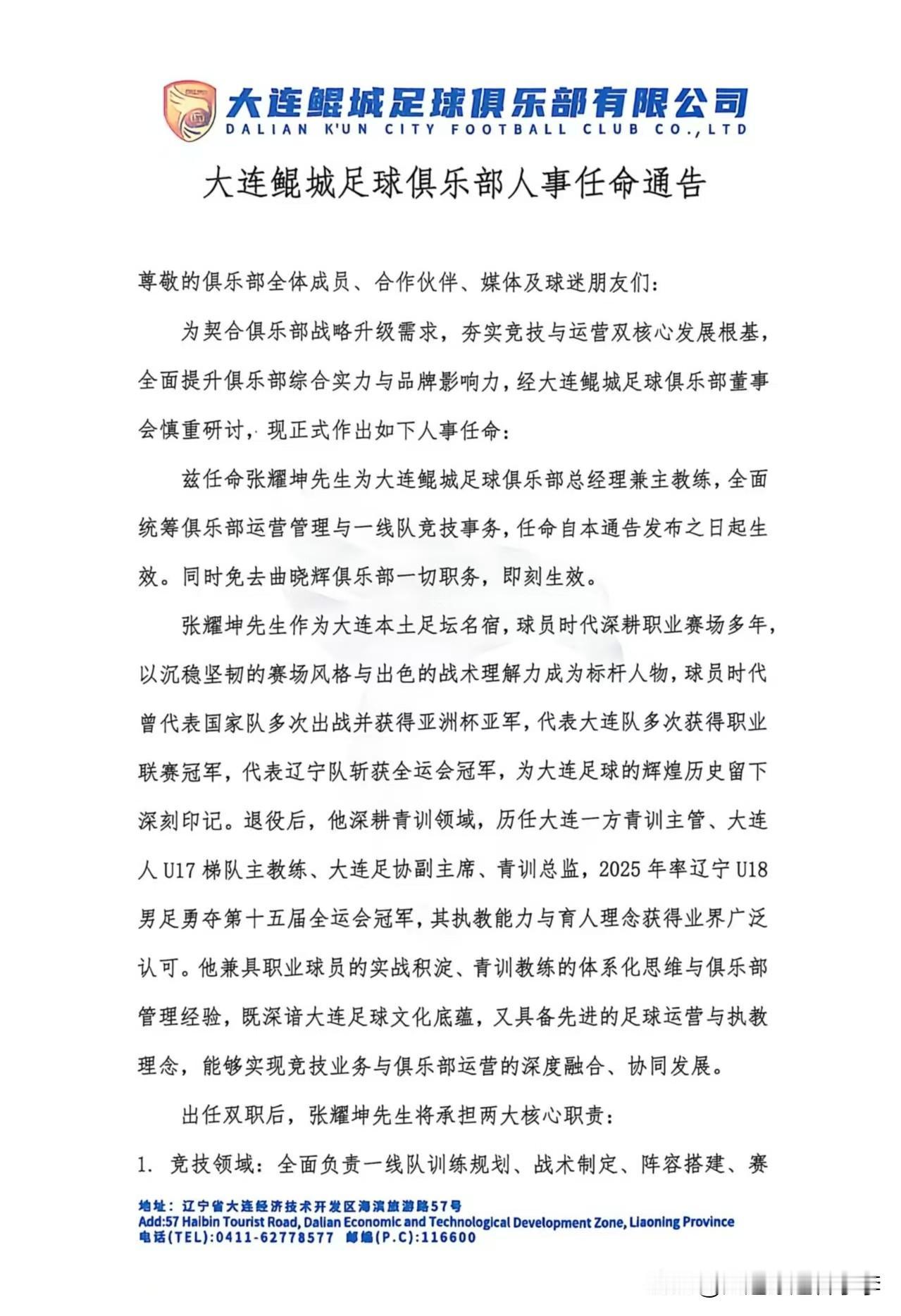 大连鲲城官方宣布,原大连实德队长张耀坤出任球队总经理兼主教练,全面统筹俱乐部运营管理与一线队竞技事务,同时免去曲晓辉一切职务。 张耀坤出任主教练也算是众望所归,年轻有活力,刚带领辽宁U18男足获得全运会金牌,技战术打法也广受认可。但是免去曲晓辉一切职务,从措辞上感觉曲晓辉像犯了错误似的,冷冰冰的,连一句感谢的话都没有,怎么说曲晓辉对大连鲲城的成长与发展还是做出了很大贡献的,以这样的方式分手不应该。 张耀坤此前一直在大连做青训梯队的执教工作,我想随着张耀坤出任大连鲲城主教练,也会有不少年轻球员随之加盟吧! 加油大连鲲城,加油大连足球!