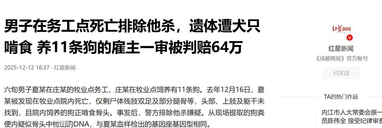 内蒙古的庄某养11条狗(4条大型犬仅拴2条,余皆散养),雇60岁夏某看护牧业点,未签合同、不买保险。14天未联系后,庄某发现狗啃食疑似人骨,夏某遗体残缺。警方排除他杀,狗粪DNA证实死者为夏某。家属索赔64万,法院认定庄某未尽管理与雇主责任,判其赔偿641237元。 网友评论: 还说狗是人类的朋友呢,这事儿看得人后背发凉,散养大型犬就是埋隐患。 凭啥不担刑事责任啊?明知有风险还不管不顾,这和过失伤人有啥区别。 老人家人十四天也没联系?但凡多问一句,说不定就能避免这场惨剧。 64万看着多,可一条人命加死后遗体遭损毁的尊严,这点钱根本不够赔。 狗患早就该好好管管了,违规养狗的代价太低,才总有人心存侥幸。 这判决只赔钱太轻了,必须让狗主人蹲几天牢,才能让更多人长记性。 雇主也太漠视生命了,不签合同不买保险,十四天不闻不问,良心不会痛吗。