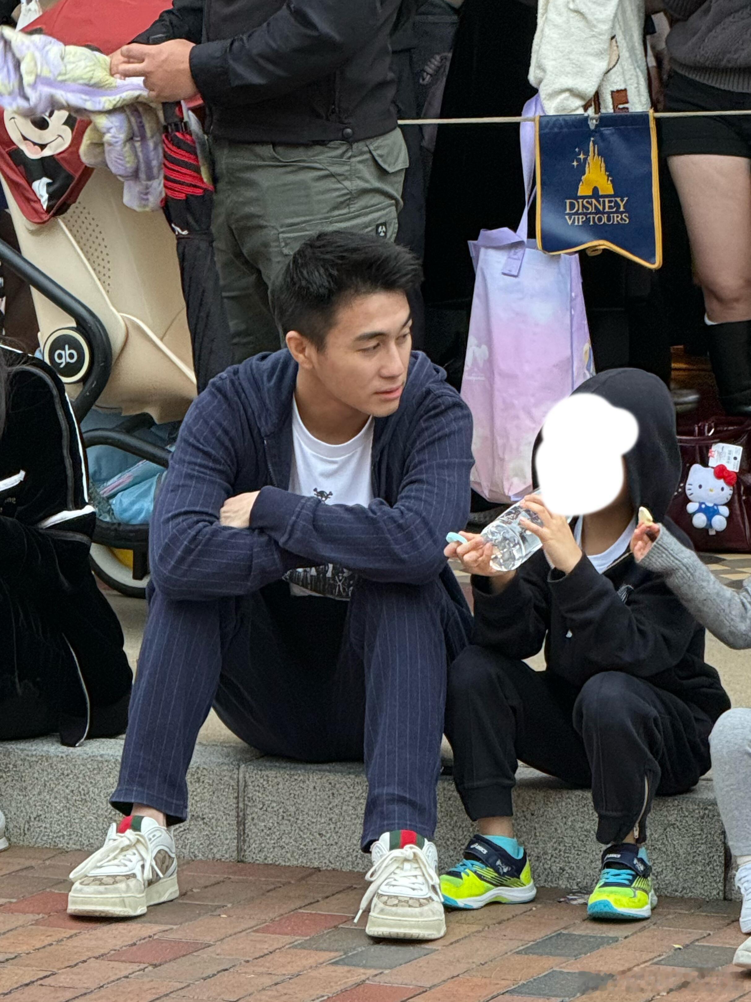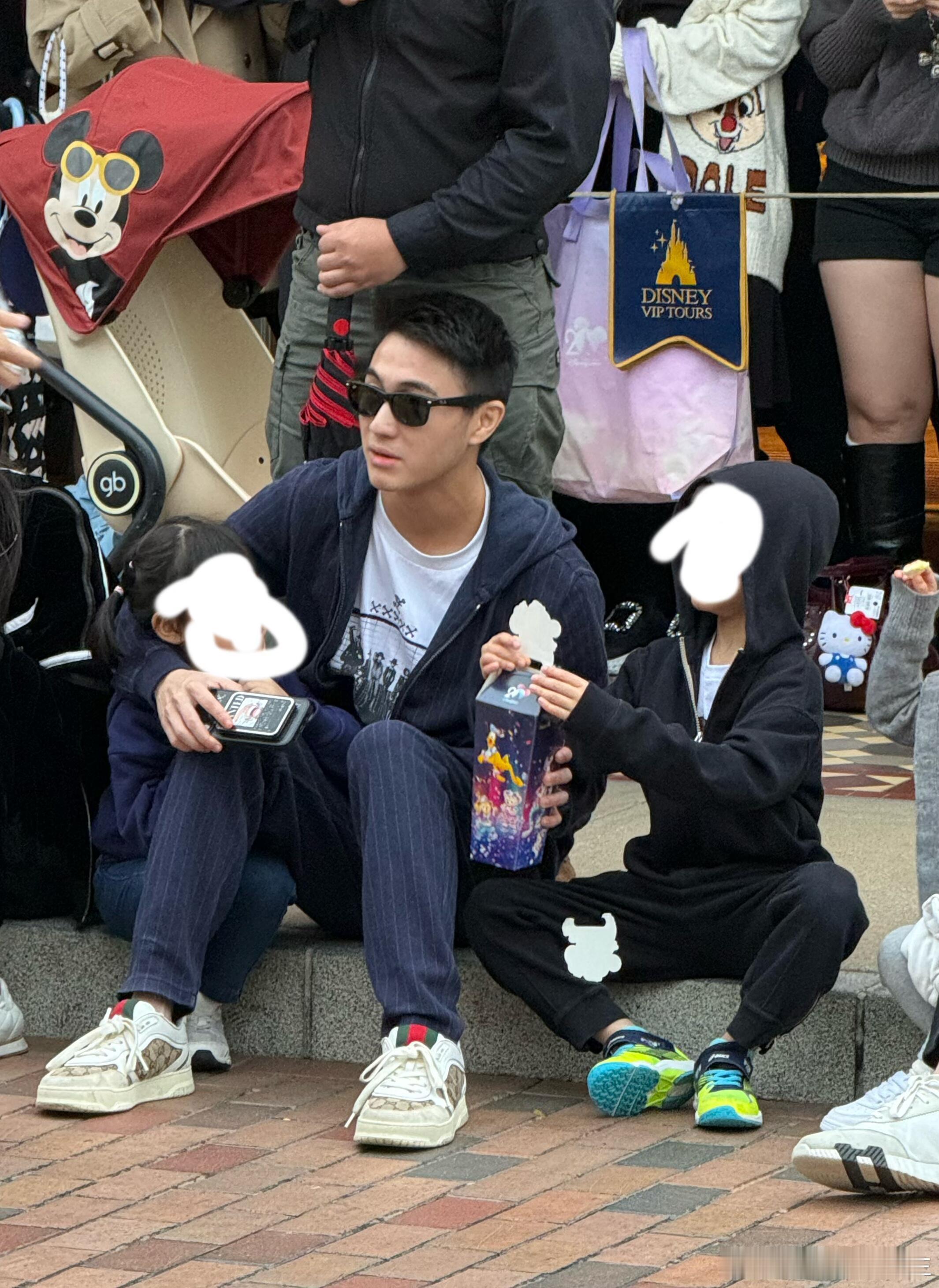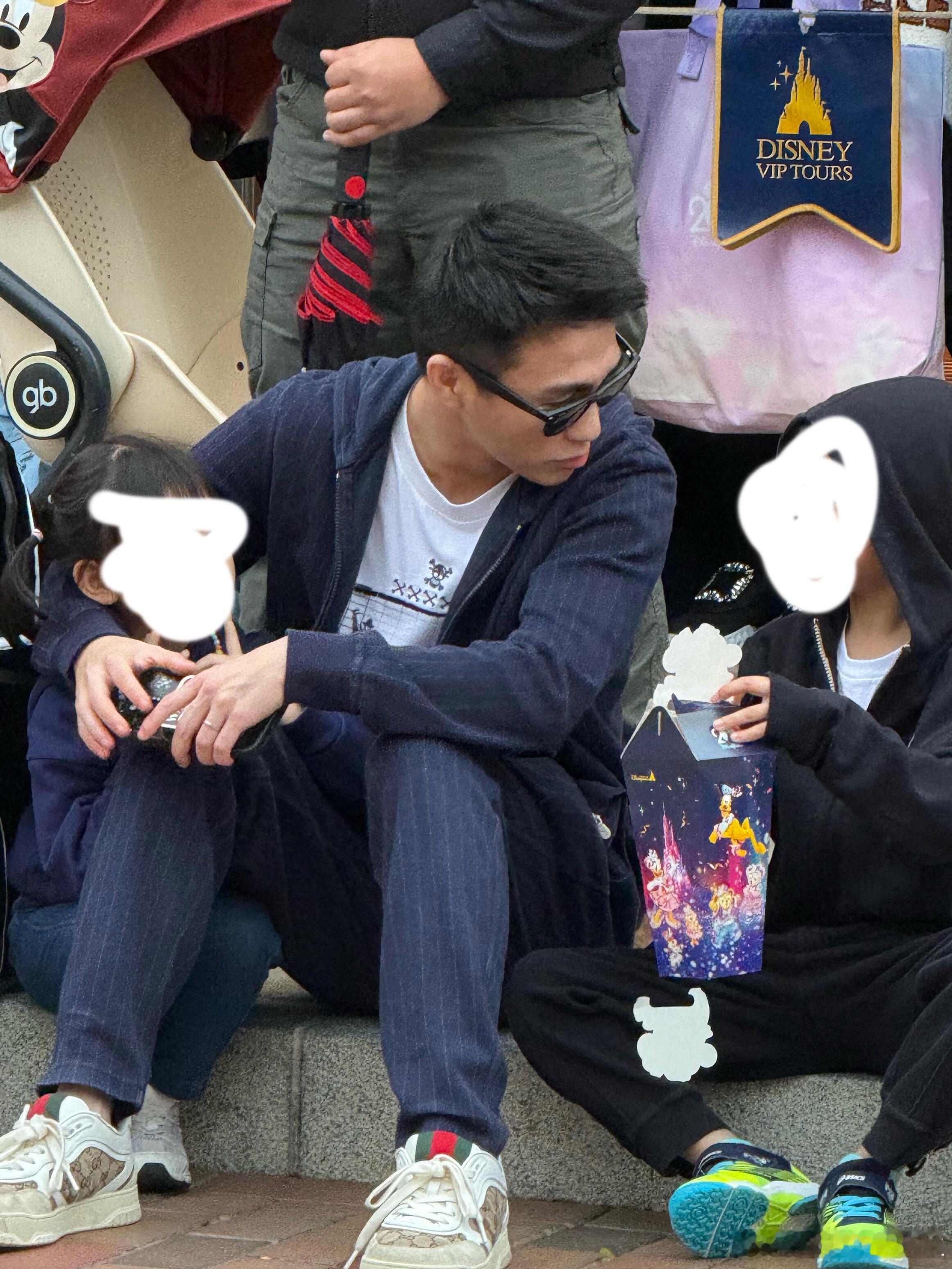 何猷君带儿女游玩迪士尼何猷君和儿女坐路边看花车巡游 何猷君带儿女游玩迪士尼,三人席地而坐看花车巡游,奶爸范儿十足!