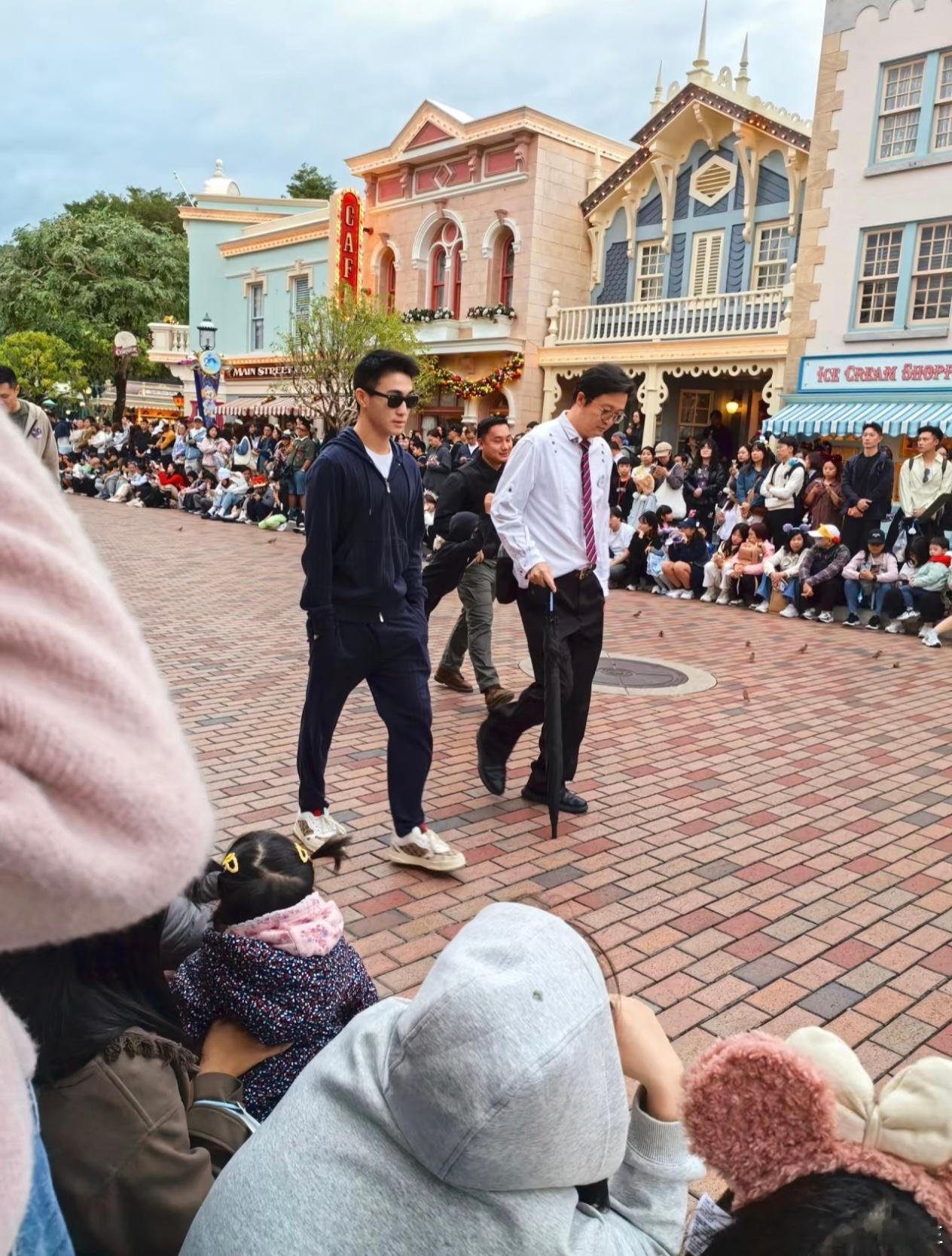 何猷君带儿女游玩迪士尼何猷君和儿女坐路边看花车巡游何猷君带儿女游玩迪士尼,三人