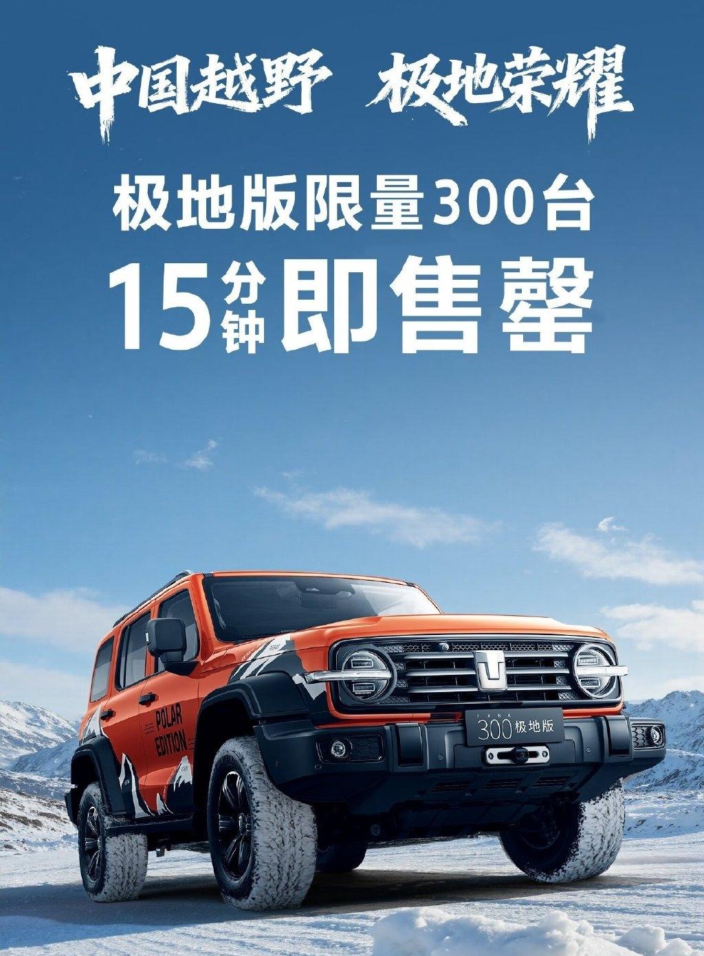 惊艳,又一款上市!15分钟售罄!中国越野车坦克,媲美国外大牌,一直更新不断! 1、2020年12月17日:坦克300越野版上市,品牌未独立时首款核心车型 2、2022年6月24日:坦克300边境限定版上市,首批限量3000台 3、2023年3月30日:2023款坦克500上市,售价33.5-39.5万元 4、2023年6月26日:坦克500 Hi4-T上市,单款车型售价33.5万元 5、2023年8月11日:2024款坦克300上市,新增2.0T轻混穿越者版 6、2023年9月25日:坦克400 Hi4-T正式上市,推出机能版、超能版两款 7、2024年2月26日:坦克700 Hi4-T上市,此前首发限定版70万元限量70台 8、2025年8月27日:全新坦克500上市,搭载长城Hi4技术焕新亮相。 没想到,2025年12月11日上市的坦克300极地版,这款22.68万起的极地越野神器,用时仅15分钟就售罄! 作为首款登陆南极的中国越野车,坦克300极地版全球限量300台,2.0T汽油版售22.68万元,2.4T柴油版24.48万元。专属极地橙车身搭配荣耀徽章与锋芒拉花,辨识度拉满,内饰头枕还烫印南极版图,尽显专属感。 核心亮点是极地定制配置:-35℃低温下可“一把着车”,远程控制前风挡加热告别结冰烦恼。可选装雪地征服包(AT全地形轮胎)、冬日守护包等,原厂集成9500磅遥控绞盘+2.5吨牵引资质,搭配四驱系统与十种驾驶模式,冰雪、戈壁路况轻松拿捏,硬核越野实力拉满。