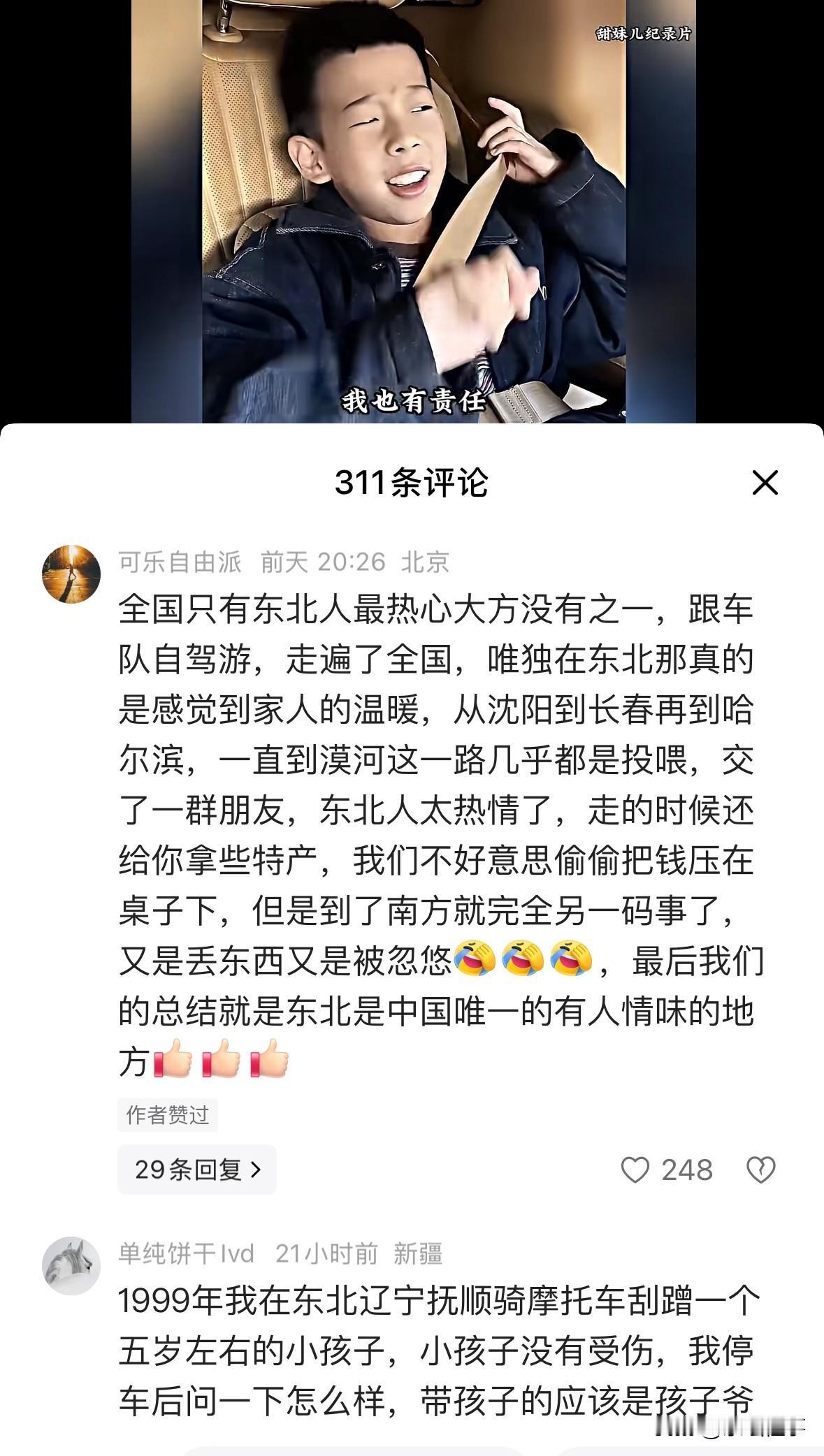 东北是最有人情味的地方: 1、全国只有东北人最热心大方没有之一,跟车队自驾游,走遍了全国,唯独在东北那真的是感觉到家人的温暖,从沈阳到长春再到哈尔滨,一直到漠河这一路几乎都是投喂,交了一群朋友,东北人太热情了,走的时候还给你拿些特产,我们不好意思偷偷把钱压在桌子下,但是到了南方就完全另一码事了,又是丢东西又是被忽悠,最后我们的总结就是东北是中国唯一的有人情味的地方。 2、1999年我在东北辽宁抚顺骑摩托车刮蹭一个五岁左右的小孩子,小孩子没有受伤,我停车后问一下怎么样,带孩子的应该是孩子爷爷,他直接说:“没事,走吧”,我觉得他们真的很善良! 3、我姥姥被外卖小哥刮倒了,小哥吓坏了,因为我姥姥80多了,可是我姥姥爬起来自己走两步就高兴地笑了:我还挺结实嘛!没啥事!你走吧!小哥说:奶奶咱们去医院检查一下吧!姥姥说:你忙你的去,我要觉得不好我找我儿女,我自己还有劳保,你快走吧!又嘱咐周围邻居:可别告诉我儿子儿媳妇,把他们吓一跳。 来自网友留言。