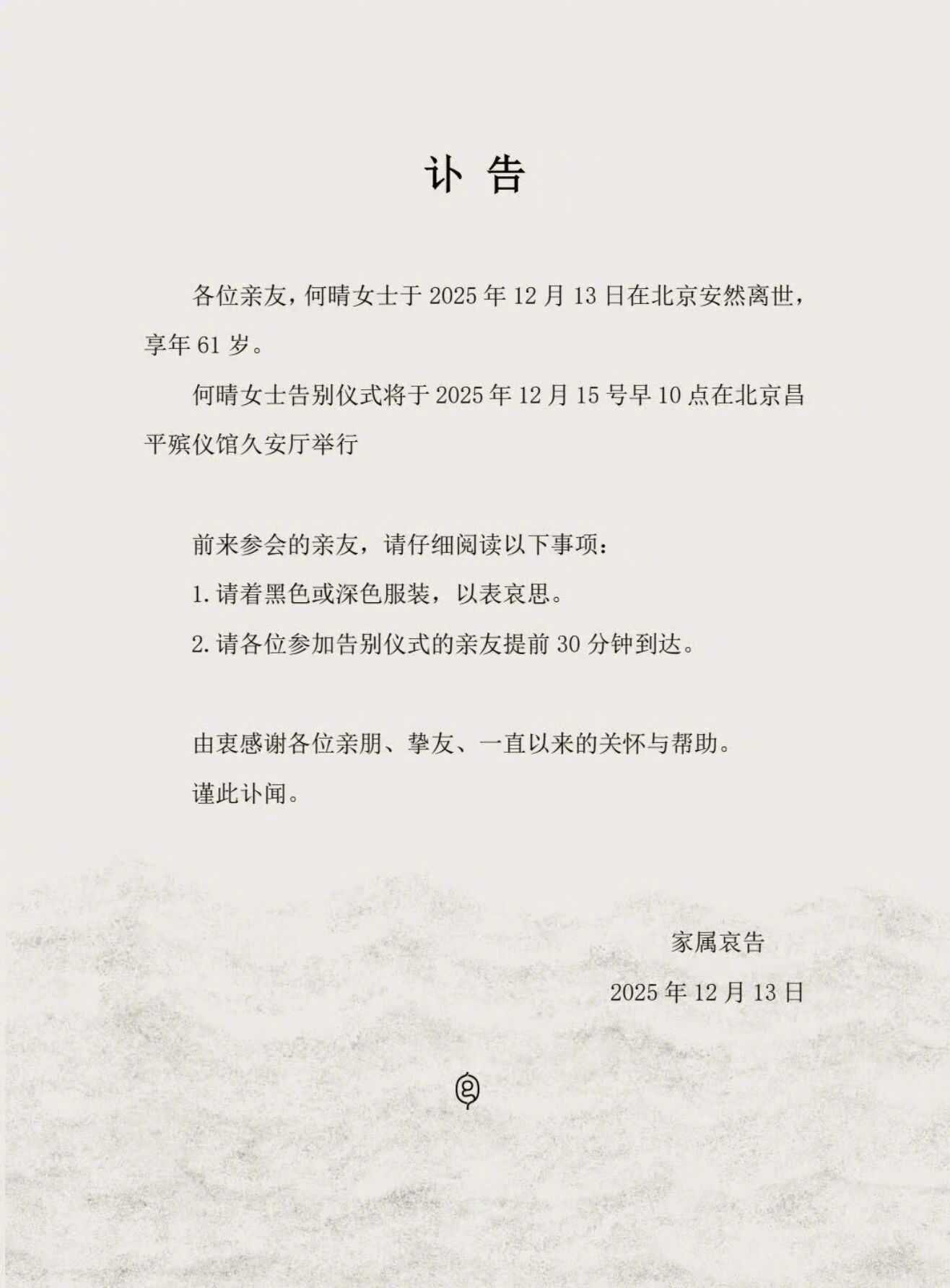 演员何晴去世 13日,知名演员何晴在北京离世,享年61岁。据家属讣告,告别仪式将于2025年12月15号早10点在北京昌平殡仪馆久安厅举行。何晴1964年出生于浙江,13岁进入浙江昆剧团学习昆曲,1983年出演《少林俗家弟子》进入影视圈,此后她陆续出演《西游记》《红楼梦》《三国演义》《水浒传》,是唯一一位演遍“四大名著”的女演员。