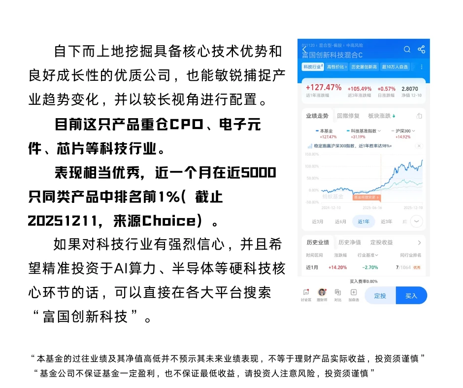 如果对科技行业有强烈信心,并且希望精准投资于AI算力、半导体等硬科技核心环节的话,可以直接在各大平台搜索“富国创新科技”。