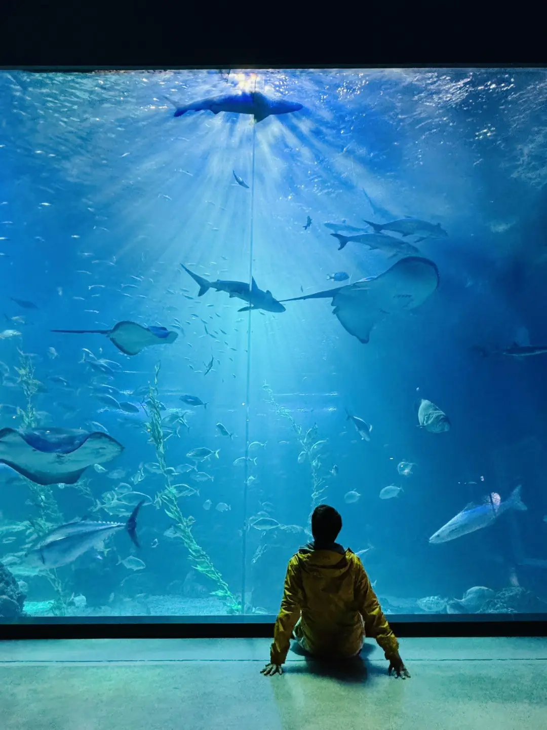 水族馆尾部展区有巨大的水族箱,坐在下面仿佛身在其中