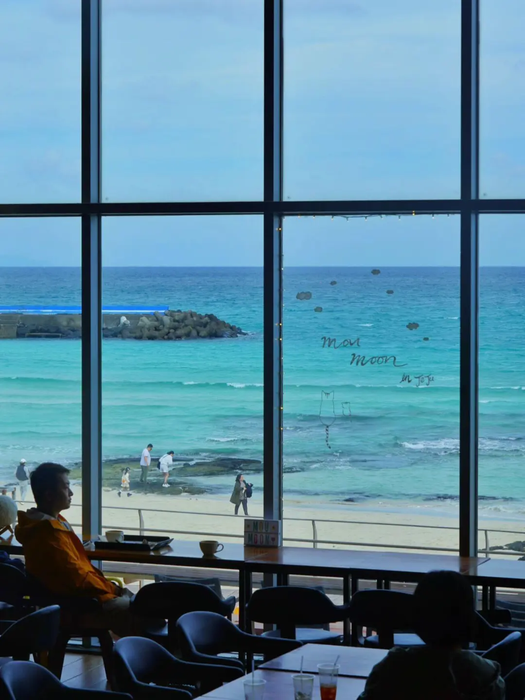 巨大的落地窗外可以看到济州岛湛蓝的海水,太美妙了