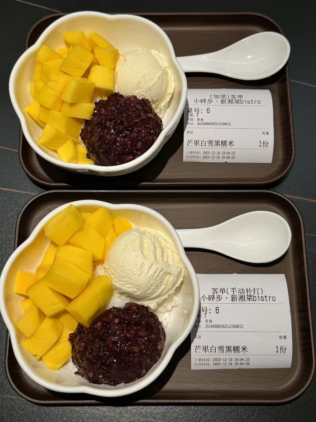 芒果白雪黑糯米真的好好吃🥹🥹可以吃到里面的糯米,口感超级丰富,椰奶加入糯米好好喝啊还有好多芒果果肉!本水果脑袋爱晕~ 做的是地道衡阳菜。山珍豆腐鲜鲍、鱼籽鱼泡、咸蛋黄鸡翅玉米…菜品都好有特色!简直是开启我湘菜新大路,一道比一道好吃嘎嘎下饭🤤 定位到:小碎步新湘菜bistro