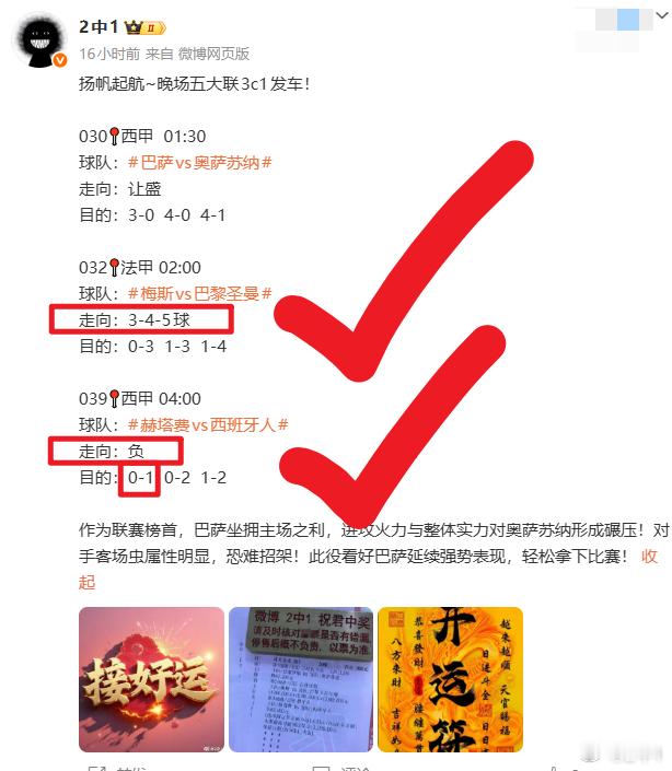 昨晚3中2是真可惜啊!被巴萨演了!原本看好巴萨在主场的优势,毕竟双方实力差距明显,历史交锋更是压倒性的,但比赛过程却有些波折,巴萨浪费了几次绝佳机会,仅差一球打穿盘口,成了昨晚唯一的遗憾!两√一× 离3中3满堂鸿真的只差一步!虽然少了一点完美,但整体判断依旧精准,状态依然在线,今晚赛事很丰富,跟上老刘继续稳步冲击满鸿!