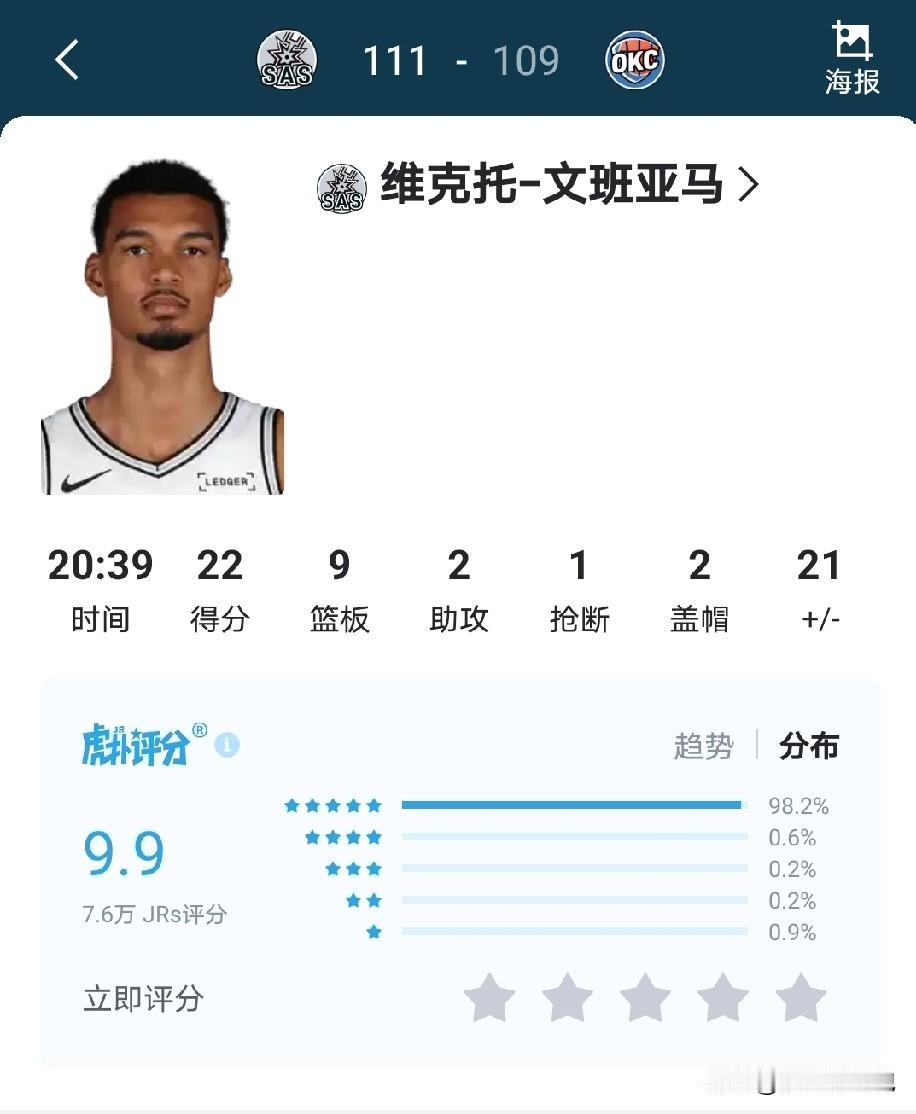 能打败bug的只有bug! 精打细算的出场时间,得到22分9篮板2助攻2盖帽1抢断,填满数据栏的同时收获+21的正负值,这不是bug是什么? 今年的雷霆也是纯纯的bug,二当家长期伤缺,战绩创造历史最佳,球队老大在26场比赛中13次三节打卡,这不是bug是什么? 肉眼可见,雷霆会建立王朝,而能阻止他们的或许只有文班亚马了。