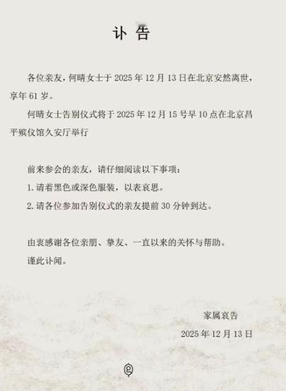 何晴竟然走了,真的太突然了! 61岁尚且年轻,如果不是患了重病,现在的何晴应该刚刚迈入安然的晚年。 刚看到家属发的讣告时,真不敢相信是真的,12月13号,何晴在北京安然走了,享年61岁,告别仪式定在15号早上,就在北京昌平的殡仪馆。 影视博主余泳已经证实了消息,他说何晴生病后一直想低调,就想让大家记住她最美的样子。 说起来,何晴的起点就带着点传奇,她是浙江江山人,14岁那年去考浙江昆剧团,本来因为身高差点被刷下来,结果唱了两首歌就被破格留下了。 1983年拍了《少林俗家弟子》才算真正踏入演艺圈,更巧的是,拍完戏坐火车回家时,遇上了杨洁导演,直接被请去《西游记》里演了怜怜,那娇俏的模样现在想起来还很清晰。 后来的事大家可能更熟,她成了内地唯一一个演遍四大名著的演员。 《红楼梦》里的秦可卿、《三国演义》里的小乔、《水浒传》里的李师师,每个角色都透着不同的韵味,难怪被叫做“古典第一美女”。 不光是古装戏,她还演过琼瑶剧《青青河边草》,是最早的大陆“瑶女郎”,琼瑶当时特别喜欢她,还为她和当局据理力争过。 她演戏从来不是只靠颜值,在《澳门的故事》里演泼辣的混血儿,在《大宅门1912》里接棒杨九红,甚至2016年在《女医明妃传》里第一次挑战反派孙太后,狠绝和温婉都藏在眼神里。 可这样爱演戏的人,2006年却为了儿子息影四年,一门心思当妈妈。 谁也没想到,2014年她突然查出了病,转年就做了开颅手术。好在康复后还拍了《爱我中华》,可那之后就慢慢淡出了荧幕。 和她在昆剧团一起学艺的六小龄童说,她昆曲功底扎实,戏路宽得很,太可惜了。 以前和她演对手戏的马德华也念叨,她是个特别尽责的演员,走得太早了。 现在再翻起那些老作品,不管是怜怜的灵动还是小乔的温婉,都还鲜活。 说白了,她把最好的样子留在了荧幕上,也留在了大家的记忆里。 以上都是个人观点,对此您有什么不同的看法,可以在评论区留言讨论!!!