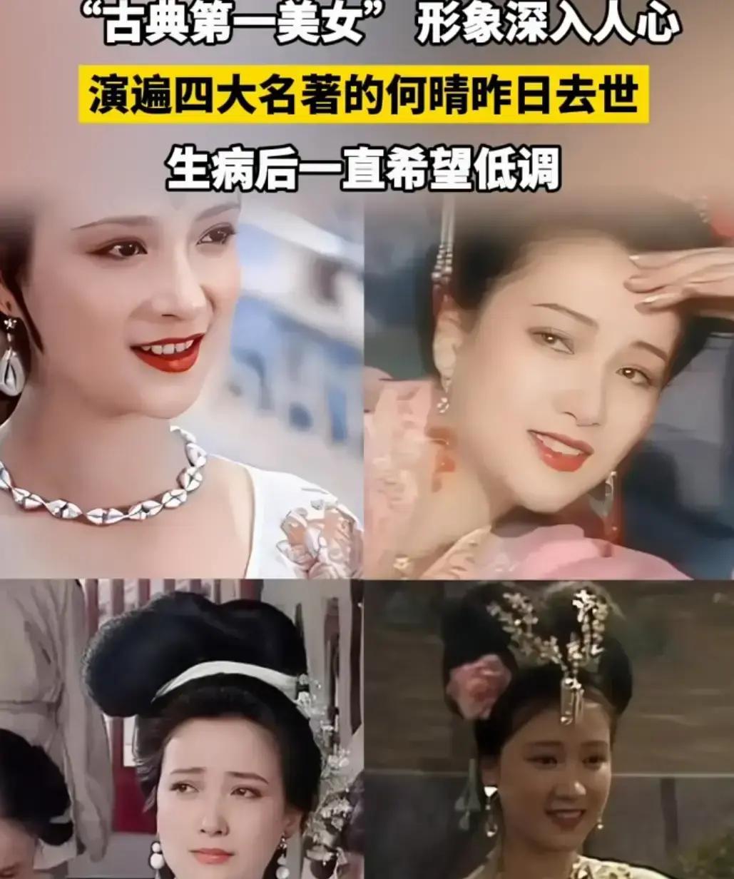 消息一出,评论区直接炸锅:唯一演遍四大名著的古典第一美女,走了。 小乔、李师师、秦可卿、灵吉菩萨,全是她。钱包掉线般的卵子数量,她却在荧幕上把古典美打到满格。 2015年查出脑瘤,扩散全身,她硬是闯关十年。感情路像闯关失败,刘威、许亚军,一段比一段虐,最后只剩儿子许何陪她。 廖京生被传再婚,他一句“别打扰”把谣言按死。圈内人夸她:气质在线,演技真能打。 天妒红颜,61岁,何晴收工。小乔轻摇羽扇,这回是真的谢幕了。