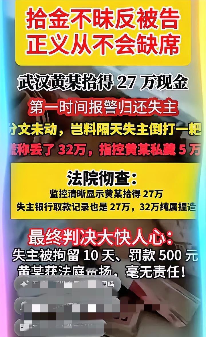 拾金不昧反被讹结果却大快人心! 这事要是换成你,你还敢做好人吗?武汉有个姓黄的大哥,路边捡到一个包,打开一看,里面整整27万现金。他第一反应不是自己悄悄揣走,而是赶紧报警,把钱一分不少交了出去。按理说,这是妥妥的正能量,结果第二天失主一出现,画风直接反转。失主一口咬定:我丢的是32万,现在只有27万,那5万肯定是你拿走了。这话一出口,别说黄某懵了,连办案民警都觉得离谱。 好在现在是法治社会,不是你嘴大你说了算。警方调监控,清清楚楚拍到黄某捡钱、报警、把钱原封不动上交的全过程,一分钱都没动。再一查失主的银行记录,当天他只取了27万,所谓“32万”纯属张口就来,想借机讹一笔。最后,法院查清真相,黄某一点责任没有,还被公开表扬;而那位失主,因为恶意诬陷,被拘留10天、罚款500元,算是给自己的贪心买了单。 这件事最扎心的地方在于:好人本来就不好当,还要被倒打一耙。如果没有监控、没有证据,好人是不是就成了冤大头?现实中,很多人不敢拾金不昧,不敢扶老人,说白了就是怕惹麻烦。我个人觉得,社会要想让“好人有好报”,不仅要靠道德号召,更要靠制度撑腰,让讹人的成本高到他不敢伸手。只有这样,做好事的人才不会寒心。你说,要是哪天你也捡到一大笔钱,你会怎么做?你觉得我们还应该坚持做好人吗?欢迎在评论区聊聊你的看法。