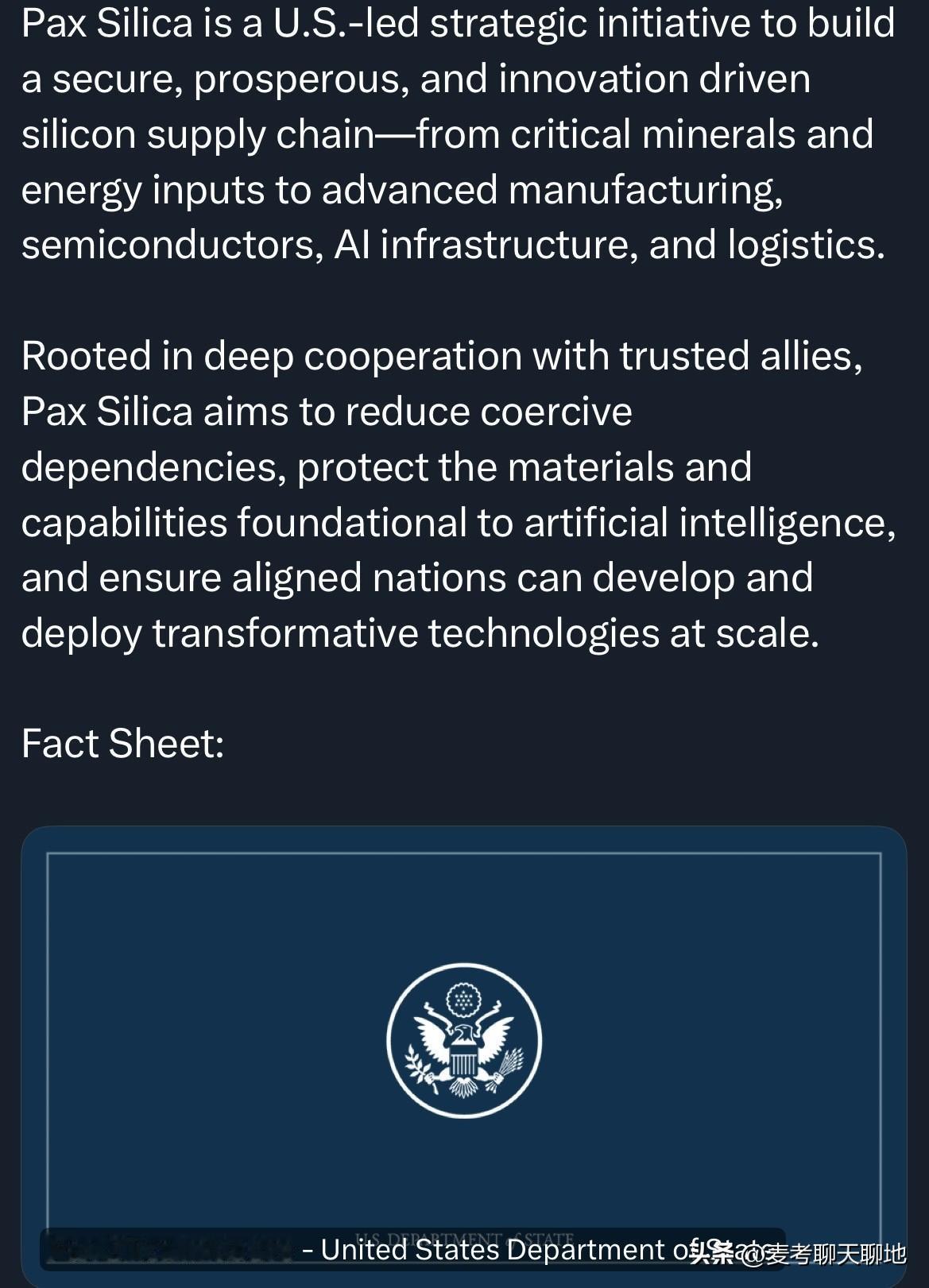 围堵东大,美国又有动作了。由国务院主导,美国在12月份正式推出“硅业联盟”(Pax Silica)战略计划。美方的意图在于构建所谓“安全、繁荣且以创新为驱动的硅供应链,涵盖从关键矿产和能源投入到先进制造、半导体、人工智能基础设施和物流的各个环节”。 “硅业联盟”植根于与美国一帮小兄弟的深度合作,致力于减少所谓“强制性依赖”,保护人工智能的基础材料和能力,并确保他们大规模开发和部署变革性技术。一句话,就是拉帮结派,围堵东大。 名称来源于拉丁语“Pax”(和平、稳定与繁荣,如Pax Americana)和“Silica”(硅化合物,精炼成硅,用于芯片制造),象征以硅为基础的计算时代将取代20世纪的石油与钢铁时代。 12月11-13日在华盛顿举办首届“硅业联盟”峰会,先由美日签署序言,12日美国、日本、韩国、澳大利亚、新加坡、以色列、英国正式签署《硅业联盟宣言》。峰会还邀请阿联酋、加拿大、荷兰、欧盟等参与讨论。倡议强调政策协调、联合投资和旗舰项目,目前处于启动阶段,未来这个班子可能会扩大。 总而言之,美国就是在寻找傀儡来协助其维持霸权,阻碍东大的发展。反过来看,我们当然也不能在任何关键技术方面对美国依赖,绝不能让他们卡脖子,尤其是晶片和人工智能技术。 东大国际战略