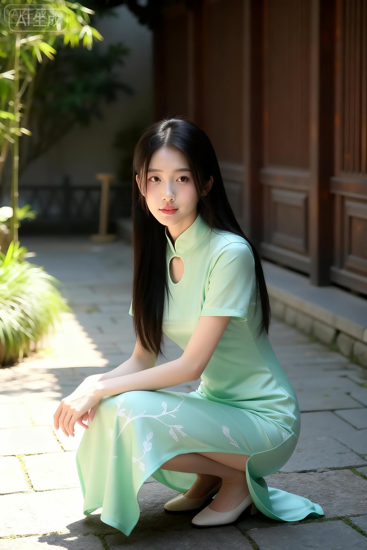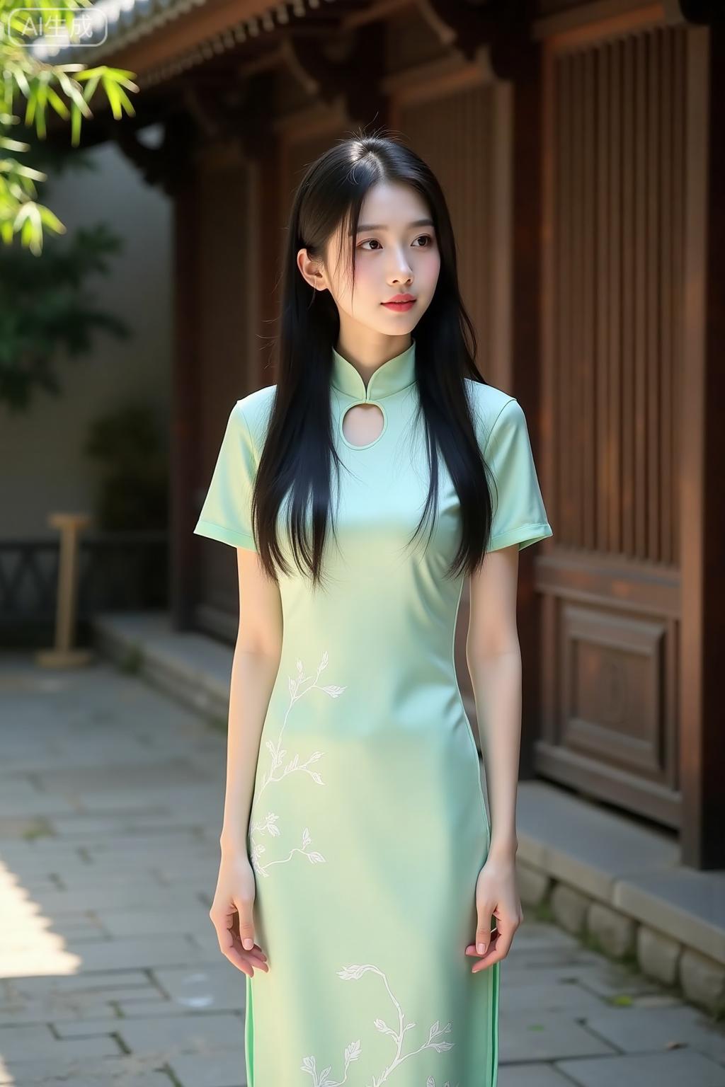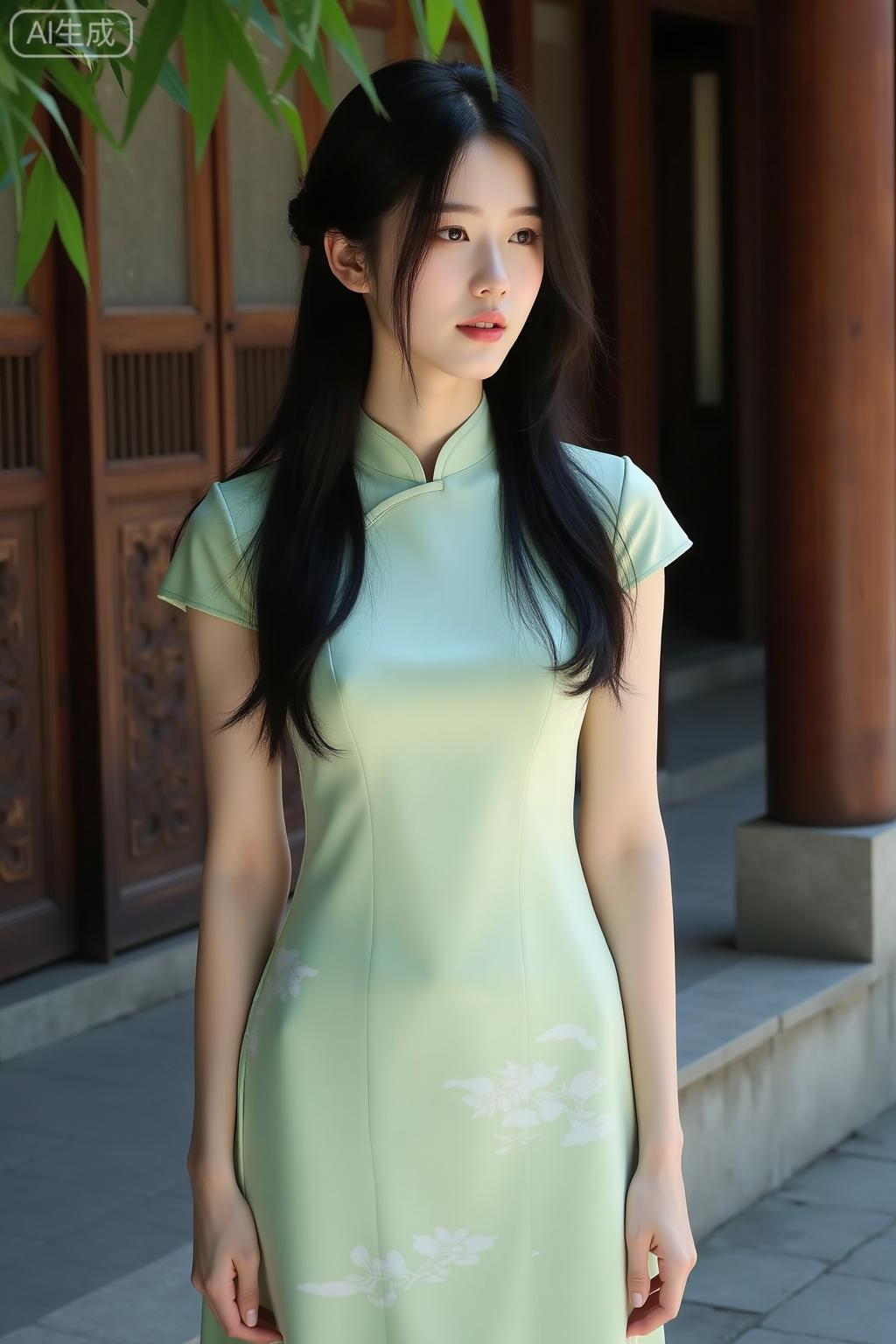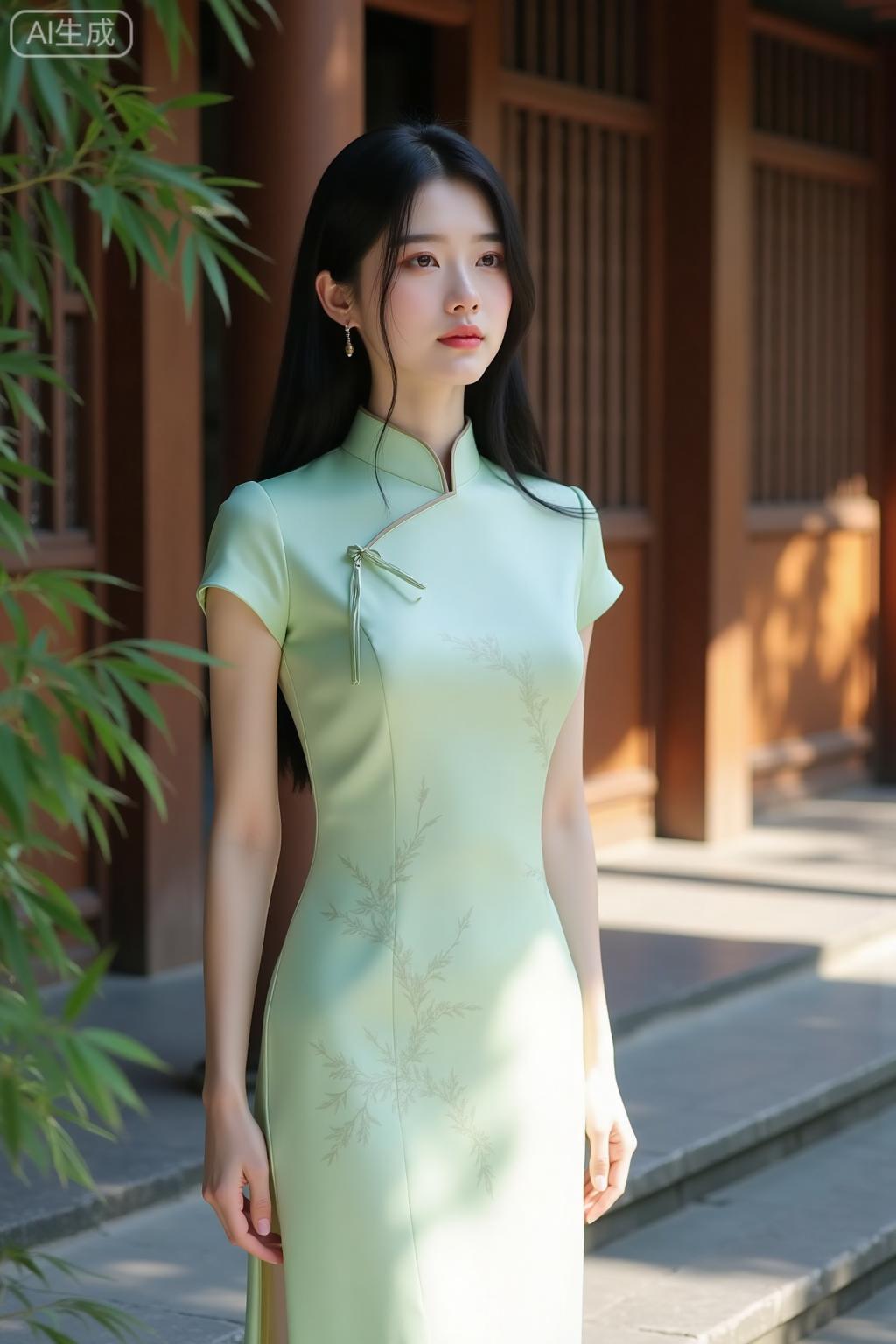 檐下竹光裹浅青,旗袍衬得眉眼柔,花影沾袖时,连古巷风都浸了雅意。 国风穿搭