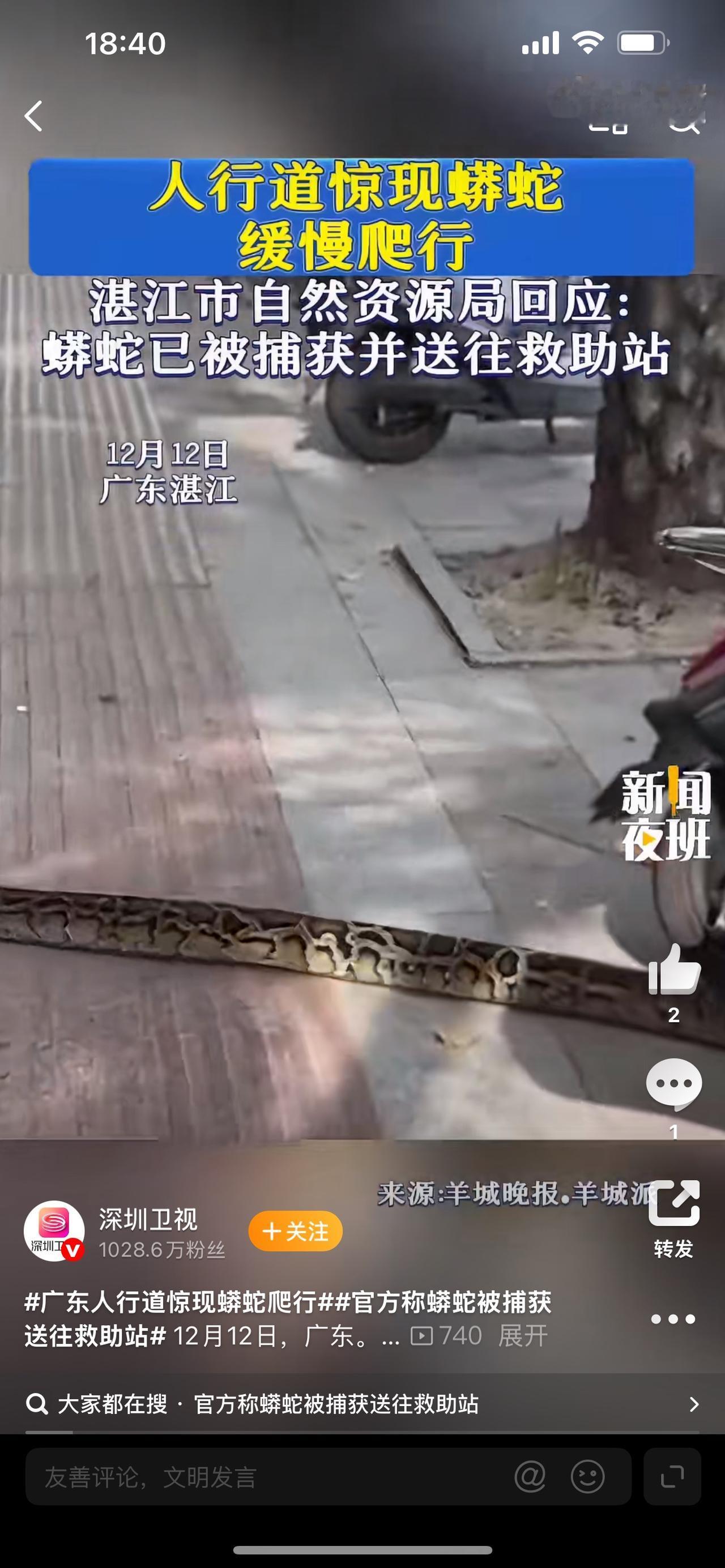 【广东湛江闹市人行道惊现2米长蟒蛇】 12月12日,湛江市赤坎区海湾路附近人行道上,一条约2米长的蟒蛇在电动自行车停放区及绿化带缓慢爬行。市民发现后立即报警,消防救援人员迅速赶到现场将蟒蛇控制,并移交至湛江寸金动物园暂时保管。后续,该蟒蛇被转送至野生动物救助站,由专业人员进行健康状况评估,以判断是否适合放生。 今年以来,广东深圳、佛山、肇庆等地已发生多起蟒蛇进入城市或近郊区域的事件: · 深圳:10月18日,一条长约2米、重约20斤的蟒蛇在深夜横穿马路时尾部遭车辆碾压,后被消防人员捕获并送往野生动物救助中心。同月,当地一废弃工业区的树上发现另一条重约20斤的蟒蛇,消防人员用水枪将其驱离至安全区域后放生。 · 佛山:8月24日,佛山市顺德区一公园内,同一棵树在半个月内两次出现蟒蛇(经确认为不同个体),均被消防人员移交至野生动物救护中心。 · 肇庆:6月23日,肇庆一农场内惊现一条长约3米、重达70斤的巨型蟒蛇,其在吞食一只约30斤重的小羊后,因受惊扰又将羊吐出并试图逃离,最终被消防人员捕获并移交林业部门,随后在适宜山林放生。 提醒 野生动物专家提醒,蟒蛇属于国家保护动物,通常不会主动攻击人类。市民若在户外遇到蟒蛇,应保持冷静,避免惊扰或擅自捕捉,及时报警或联系专业部门处理,以确保人与动物的安全。