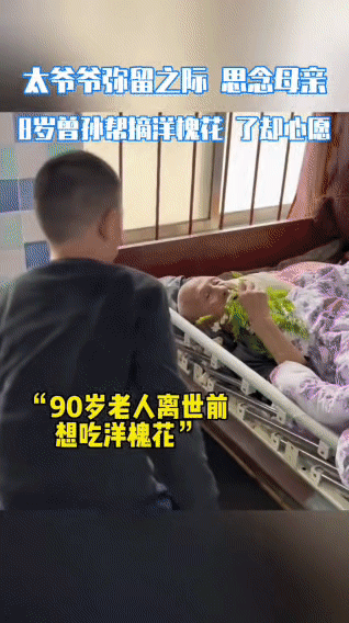 90岁的太爷爷走到弥留之际,心里却惦念着想吃洋槐花。8岁的曾孙得知后,立刻跑去为太爷爷摘下洋槐花。太爷爷吃到洋槐花后,想起了自己7岁时就离世的母亲,满是思念,就在吃完洋槐花的两天后,太爷爷安详离世,这场小小的心愿,成了他对母亲最后的念想。爷爷院子里的花 太爷爷去世 记忆