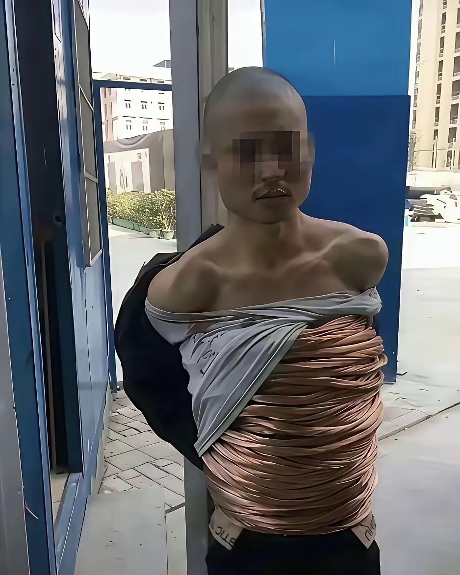随着铜价不断提高,有些人就动起了歪脑筋,竟然开始偷铜了。 看看这位小哥,竟然打起了公司主意,将铜丝一圈圈的缠绕在自己身体上,想偷带出去卖钱,结果被保安大叔抓了个正着。 据说,这么一身铜丝,足足有六十斤重。 为了钱,胆子够大的。 大家对此怎么看?