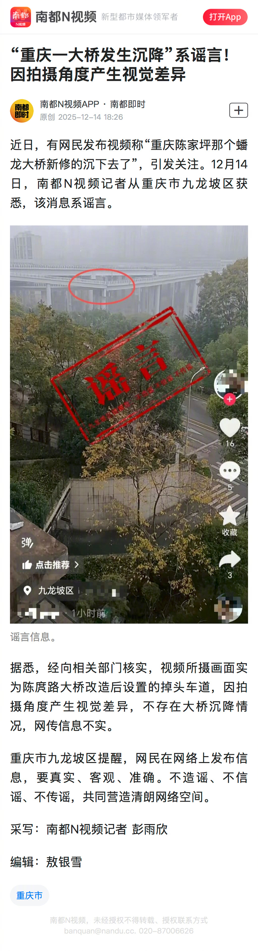 #重庆陈家坪大桥沉降系谣言#【“重庆一大桥发生沉降”系谣言!因拍摄角度产生视觉差异】#网传重庆大桥沉降实为视觉误差#近日,有网民发布视频称“重庆陈家坪那个蟠龙大桥新修的沉下去了”,引发关注。12月14日,南都N视频记者从重庆市九龙坡区获悉,该消息系谣言。据悉,经向相关部门核实,视频所摄画面实为陈庹路大桥改造后设置的掉头车道,因拍摄角度产生视觉差异,不存在大桥沉降情况,网传信息不实。重庆市九龙坡区提醒,网民在网络上发布信息,要真实、客观、准确。不造谣、不信谣、不传谣,共同营造清朗网络空间。南都N视频记者 彭雨欣