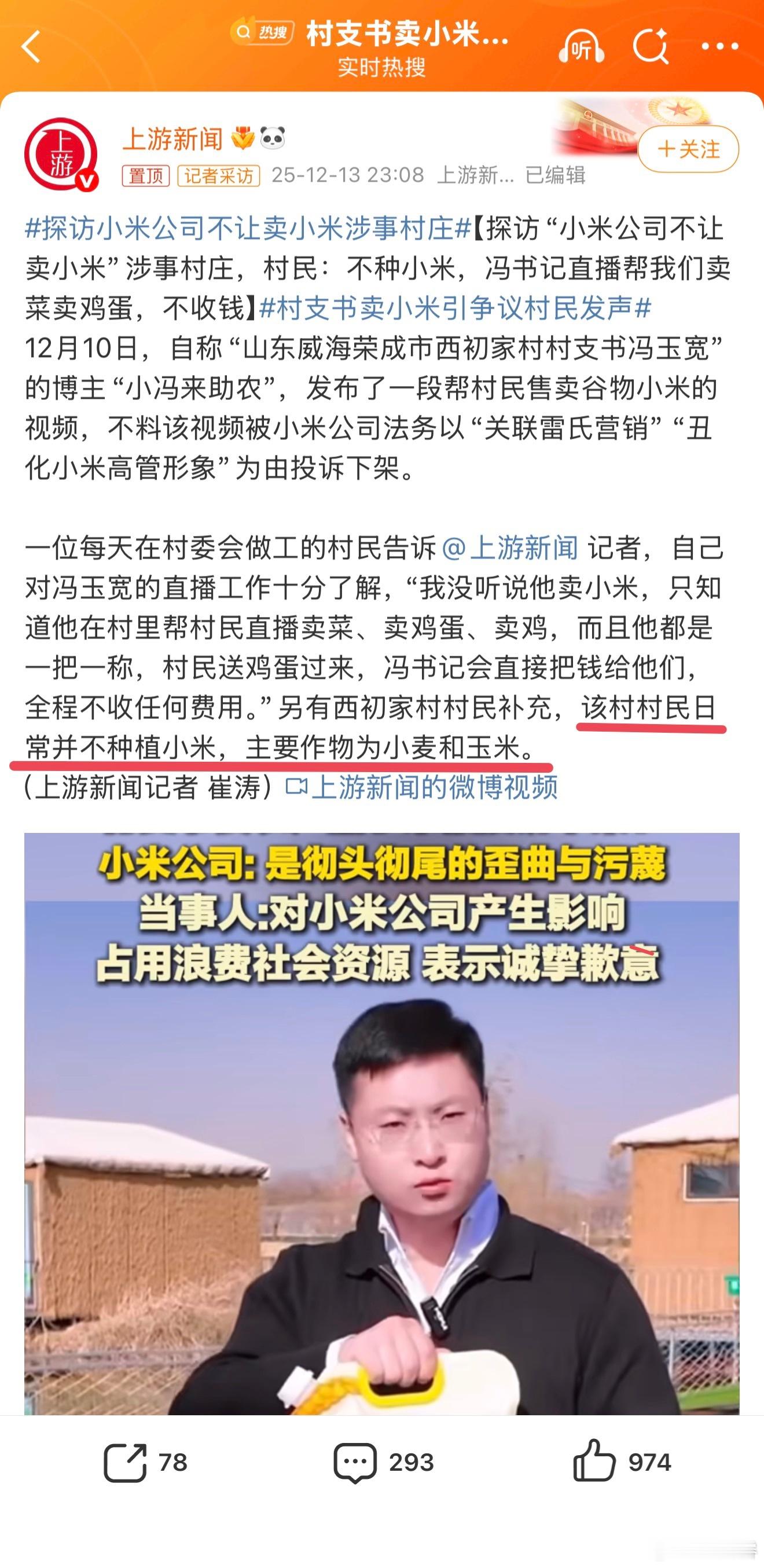 我真没想到这点破事还没有完结……村民自己都说了,他们村压根不产小米,只产小麦玉米那这个村支书「助农」助的是哪门子?助别人村?要么这个事赶紧完结,要么小米法务部周末加个班吧