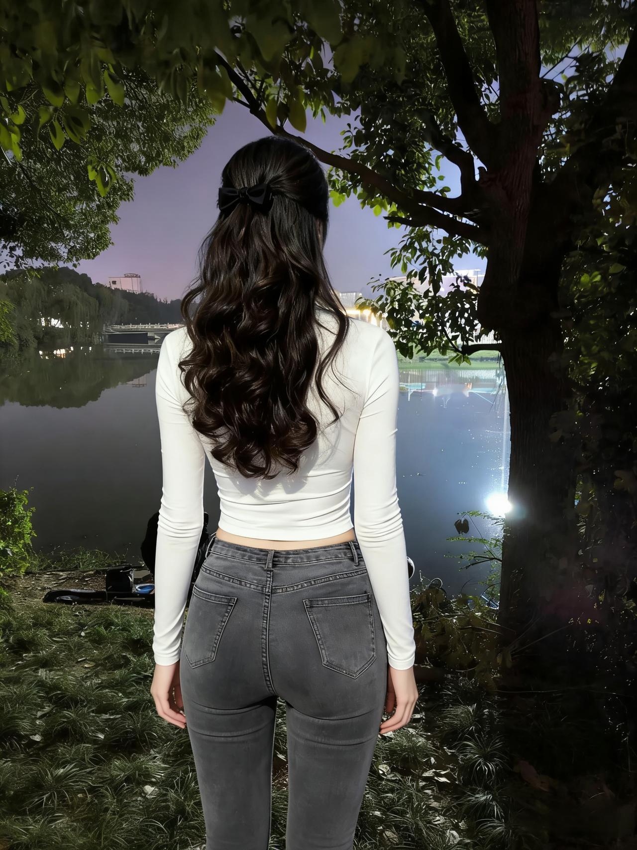 紫霞漫染暮天秋,倩女垂髫立岸头。 白衫细织凝霜色,素影孤悬映碧流。 桥畔灯摇波底月,树间风送叶边愁。 无言独望烟波远,一刹清宁胜封侯。
